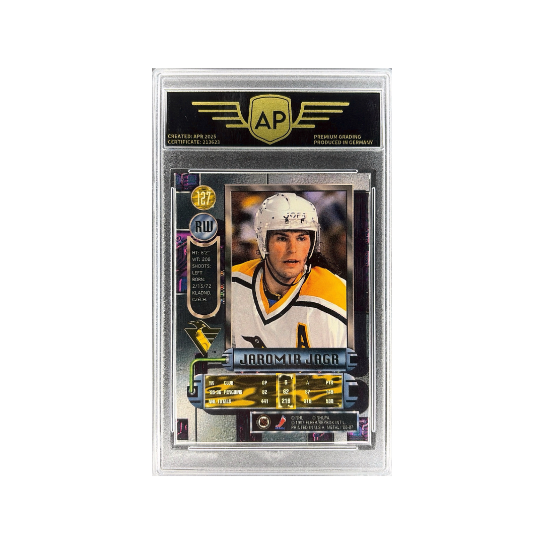 Diese Serie gehört zu den markantesten Designs der 90er Jahre und ist bekannt für ihre metallisch wirkenden Hintergründe und auffällige Optik. Die Karte zeigt Jagr in seiner Prime bei den Pittsburgh Penguins und ist ein Highlight für Sammler.