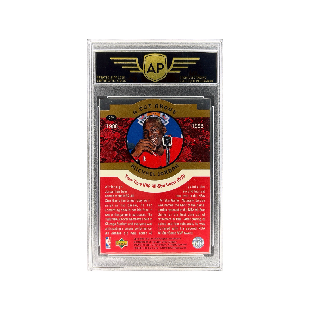 This card captures Jordan during one of the most dominant eras in NBA history, making it a must-have for basketball collectors. The "A Cut Above" insert line is known for its unique die-cut style and bold design, adding extra appeal to this already legendary player card. Professionally graded by AP Grading with a strong 8.5 NM-MINT grade.