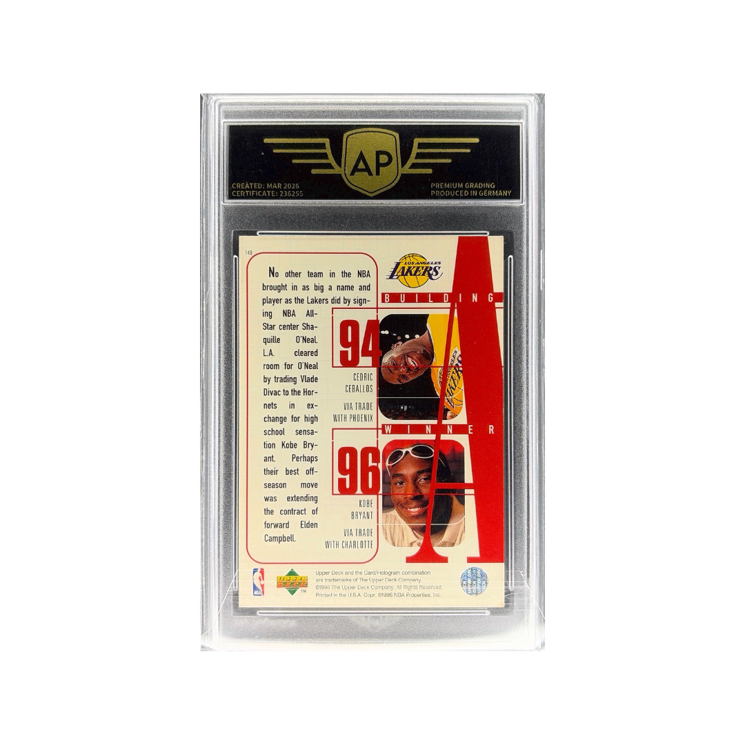 This "Building Winner" card captures a legendary era of the Los Angeles Lakers, highlighted by the early career of Kobe Bryant alongside established stars like Shaq. Cards featuring Kobe Bryant—especially from his rookie season era—are highly sought after, making this a standout collectible. Professionally graded by AP Grading with a strong 9.0 MINT grade.