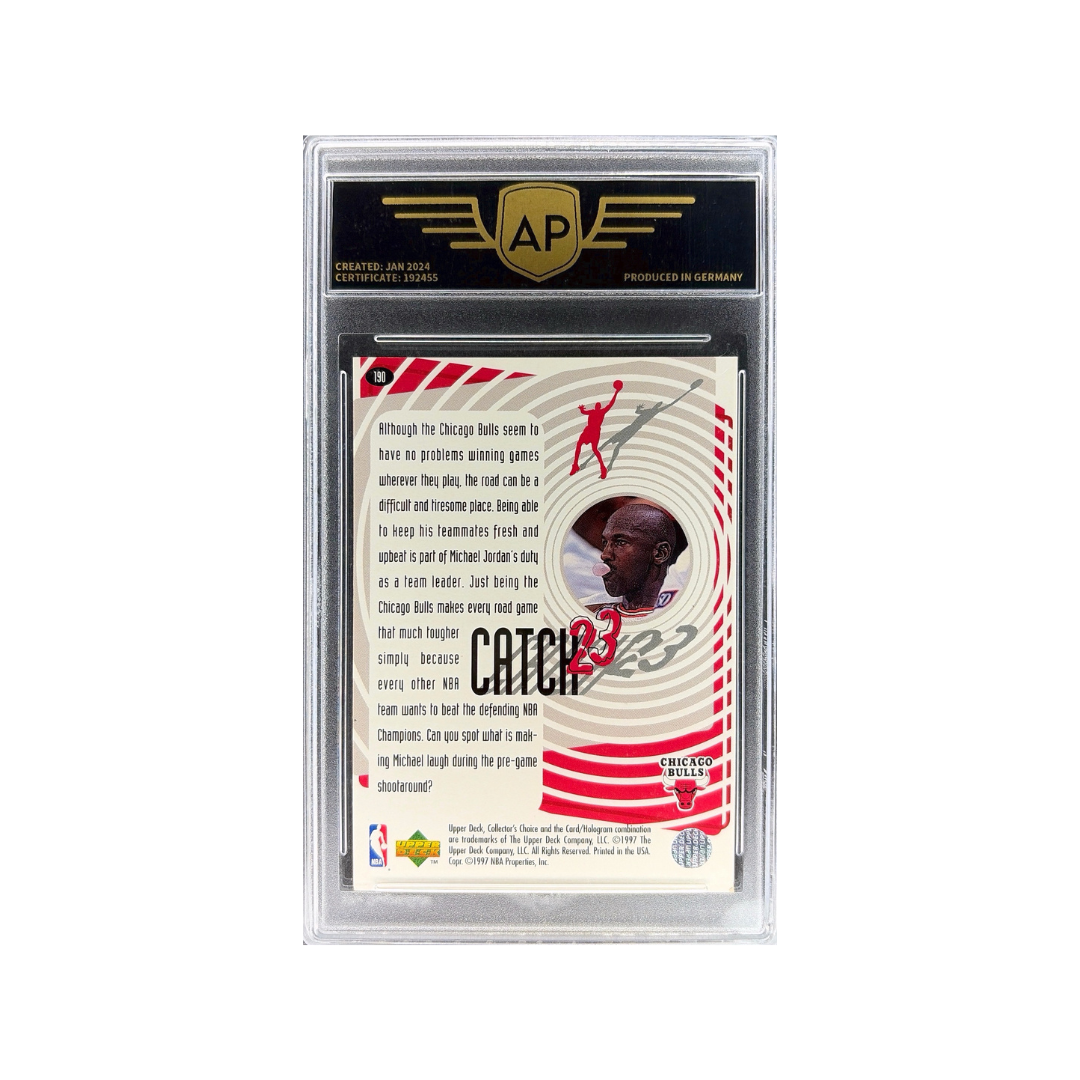 This card features Michael Jordan from the 1997–98 Upper Deck Collector's Choice set, part of the "Catch 23: Traveling Road Show" subset. The design highlights Jordan's global popularity and charisma, capturing a more relaxed and candid moment compared to typical in-game action shots. This subset celebrates his influence beyond the court during the peak of his career with the Chicago Bulls. A great collectible from the late 90s, showcasing both personality and legacy.