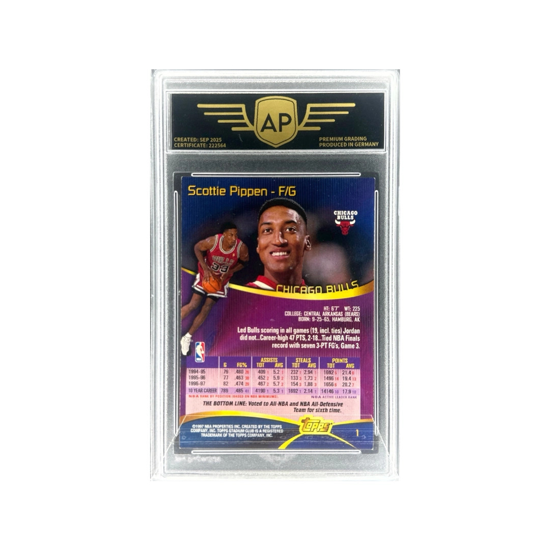 Diese Karte stammt aus der Topps Stadium Club Basketball Serie 1997 und zeigt die NBA-Legende Scottie Pippen während seiner Zeit bei den Chicago Bulls. Pippen war ein zentraler Bestandteil der Bulls-Dynastie der 1990er-Jahre und gewann gemeinsam mit Michael Jordan sechs NBA-Meisterschaften.