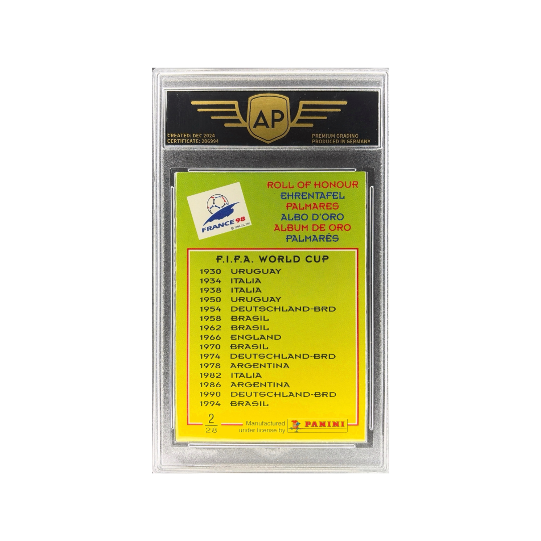 This limited insert (2/28) was part of a special Nestlé promotion during the 1998 World Cup in France. The vibrant foil background and trophy design make it a standout collectible tied to one of football’s most memorable tournaments.