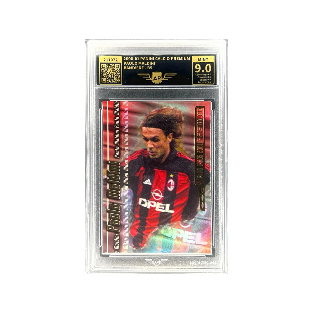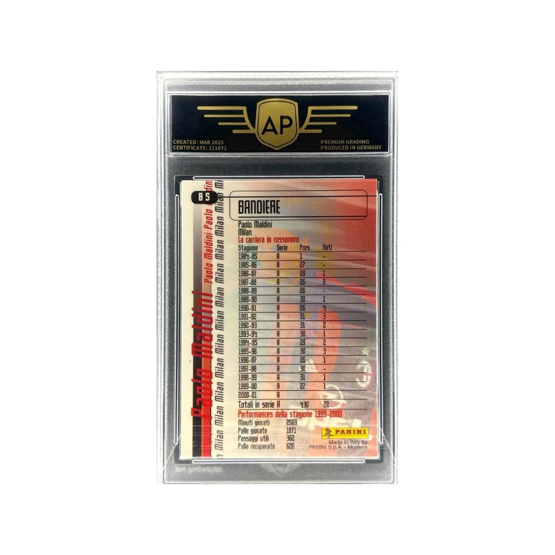 Diese Karte aus dem Set 2000–01 Panini Calcio Premium zeigt die italienische Fußballlegende Paolo Maldini aus der Insert-Serie "Bandiere", die Spielern gewidmet ist, die als Vereinsikonen ihre Teams über viele Jahre geprägt haben. Maldini verbrachte seine gesamte Profikarriere beim AC Mailand, gewann zahlreiche Serie-A-Titel sowie mehrere UEFA-Champions-League-Trophäen und gilt als einer der größten Verteidiger der Fußballgeschichte. Inserts aus den frühen 2000er Jahren der Panini-Calcio-Serie sind bei Sammlern besonders beliebt, da sie eine der stärksten Epochen des italienischen Fußballs widerspiegeln.