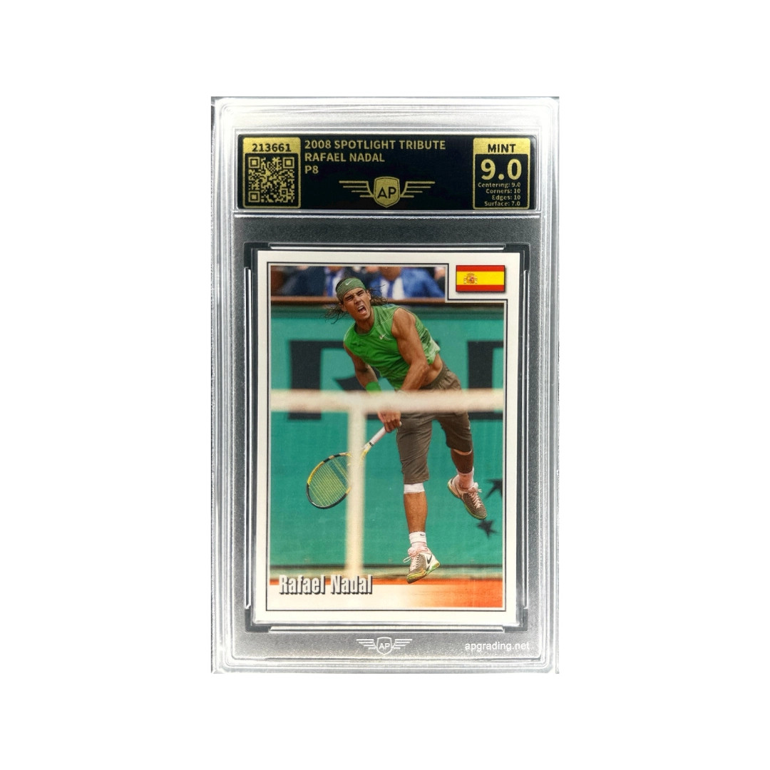 This card from the 2008 Spotlight Tribute series features Spanish tennis legend Rafael Nadal, widely regarded as one of the greatest tennis players in history.
