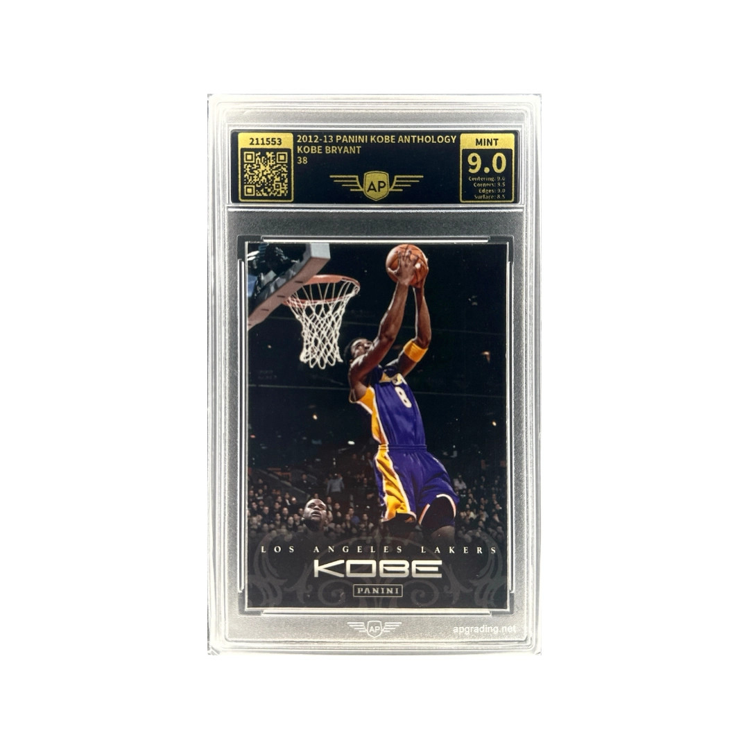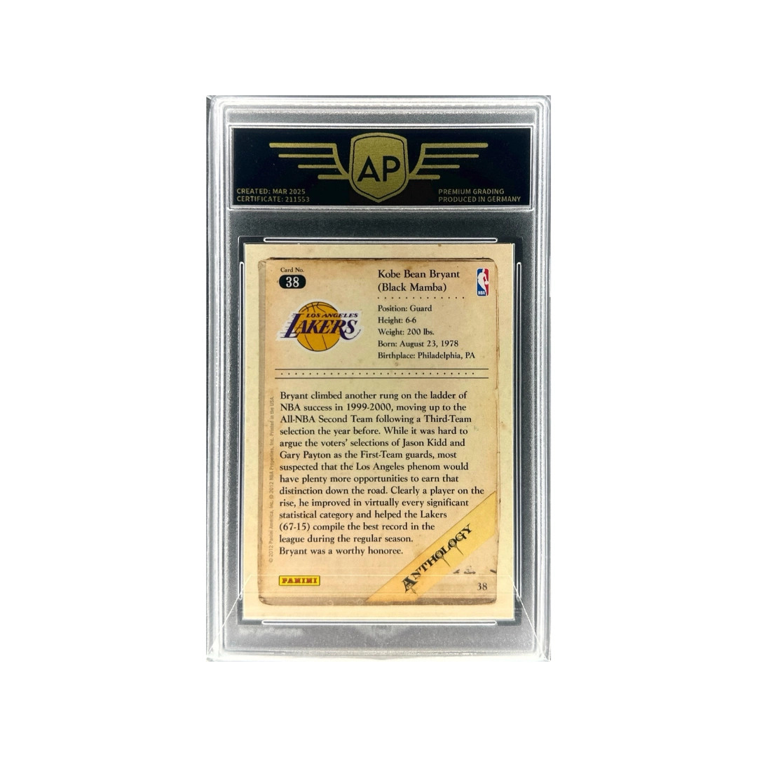 Diese Karte aus dem Set 2012–13 Panini Kobe Anthology zeigt Kobe Bryant während seiner legendären Karriere bei den Los Angeles Lakers. Die Kobe Anthology Serie wurde als spezielle Tribute-Kollektion veröffentlicht und würdigt die wichtigsten Momente und Erfolge von Bryants außergewöhnlicher Karriere. Als einer der größten Basketballspieler aller Zeiten prägte Bryant die NBA mit seiner Scoring-Stärke, seinem enormen Wettbewerbsgeist und fünf gewonnenen NBA-Meisterschaften. Karten aus dieser besonderen Anthology-Serie sind bei Sammlern und Basketballfans sehr beliebt. Ein Exemplar im 9.0 (MINT) Grade ist ein attraktives Sammlerstück zu Ehren einer der größten NBA-Legenden.