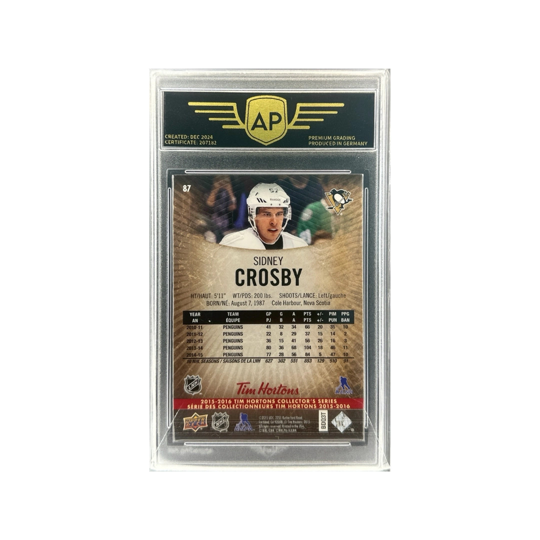 Diese Karte aus dem Set 2015–16 Upper Deck Tim Hortons Collector's Series zeigt Sidney Crosby, einen der erfolgreichsten Spieler der modernen NHL-Geschichte. Als langjähriger Kapitän der Pittsburgh Penguins und mehrfacher Stanley-Cup-Sieger gehört Crosby zu den prägendsten Spielern seiner Generation, weshalb seine Karten bei Sammlern weiterhin sehr gefragt sind. Die Tim Hortons Collector's Series hat sich zu einer beliebten jährlichen Veröffentlichung unter Hockey-Sammlern entwickelt und bietet Karten vieler NHL-Topstars. Ein Exemplar im 8.5 (NM–MINT) Grade stellt ein solides Sammlerstück eines der bekanntesten Spieler der Liga dar.