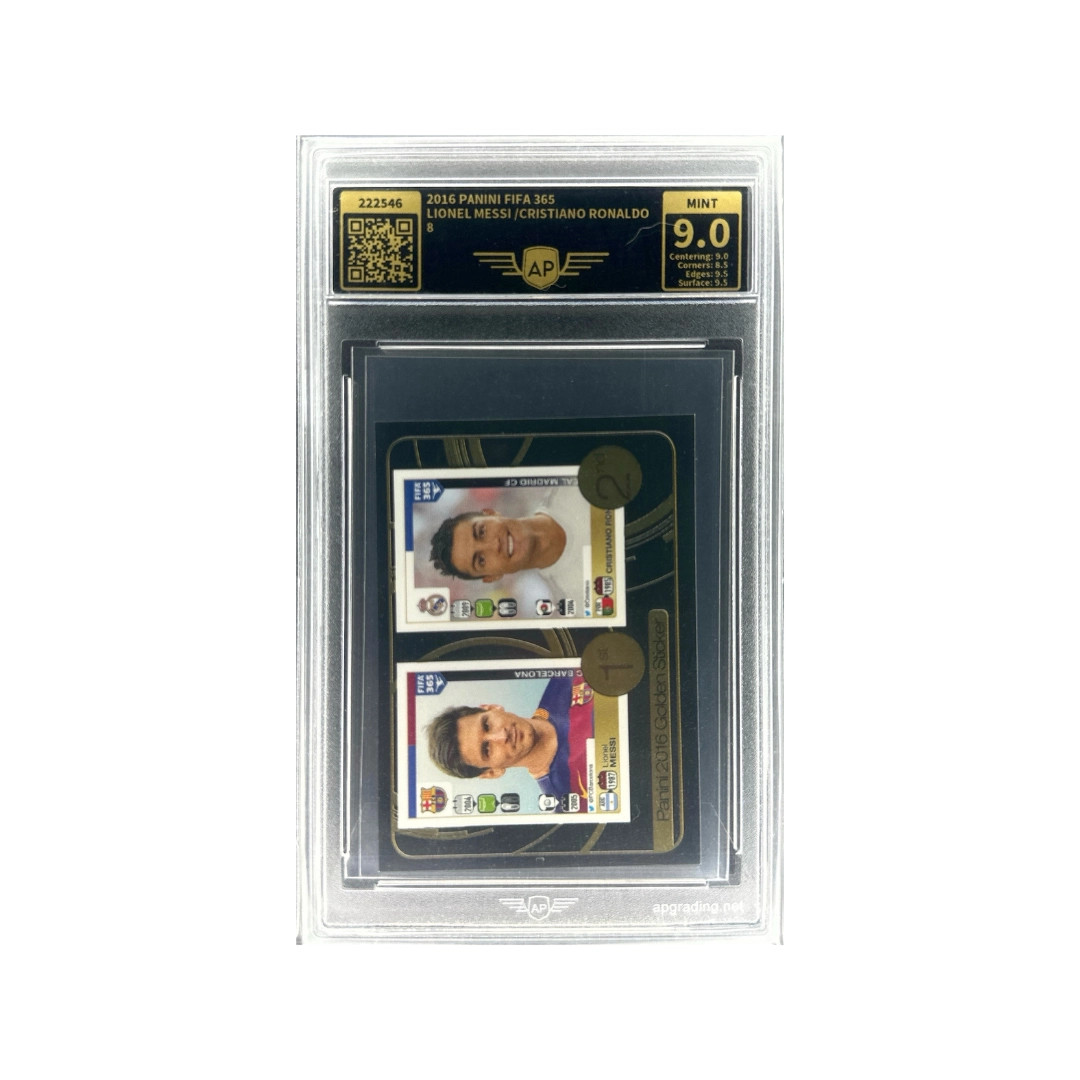 Diese Karte stammt aus der Panini FIFA 365 Serie 2016 und zeigt zwei der größten Fußballspieler aller Zeiten: Lionel Messi und Cristiano Ronaldo. Beide Spieler prägten den internationalen Fußball über viele Jahre und gewannen zahlreiche nationale sowie internationale Titel.