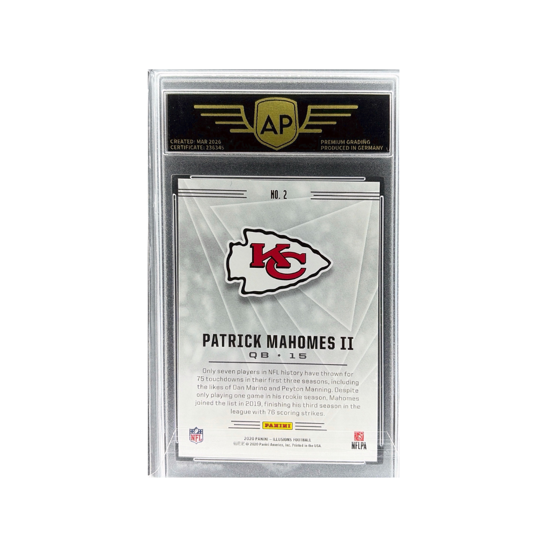 The Illusions series is known for its eye-catching holographic designs and layered visuals, making it a favorite among modern collectors. This Retail version highlights Mahomes in a dynamic dual-image layout. Professionally graded by AP Grading with an excellent overall grade of 9.5 MINT+.