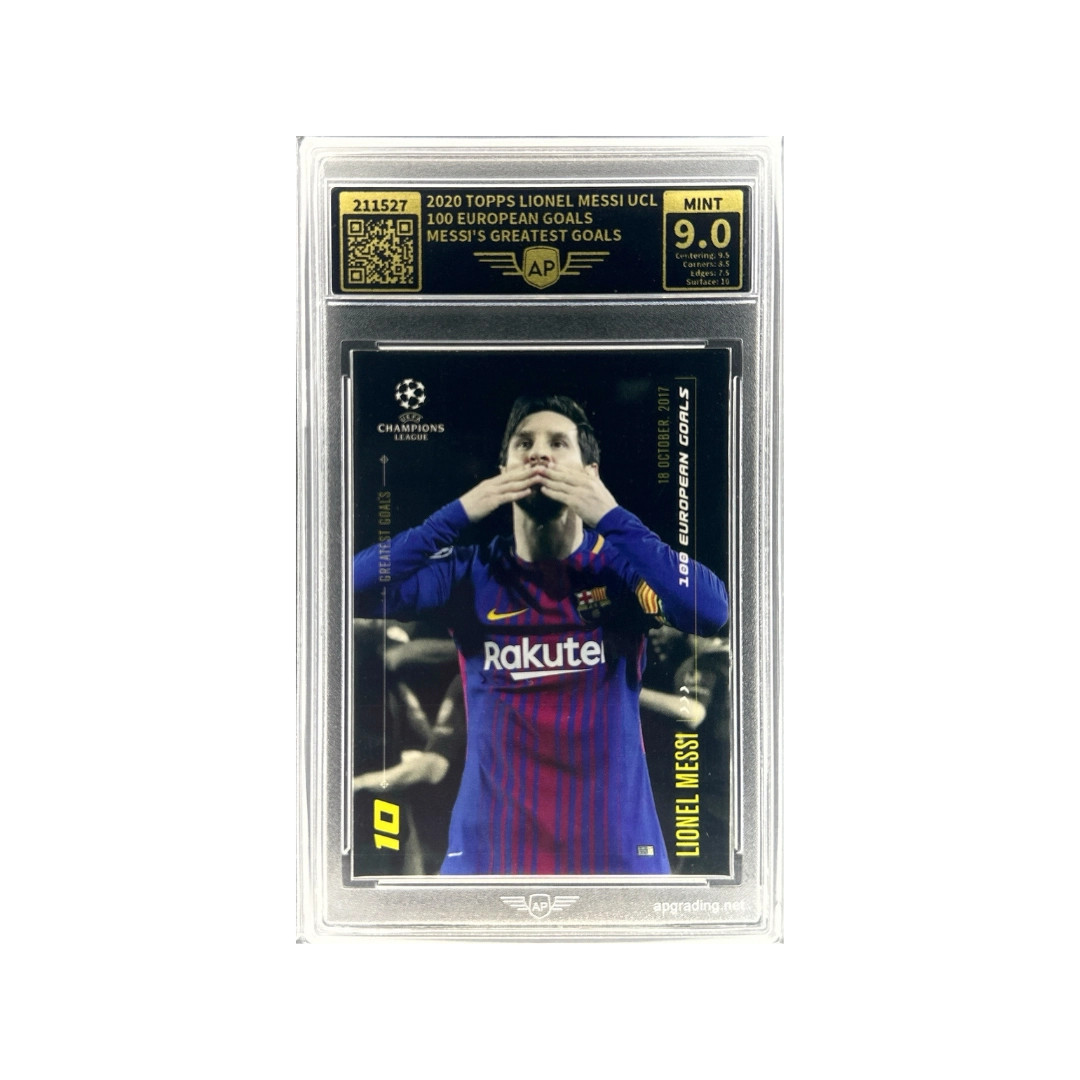 This card from the 2020 Topps UEFA Champions League set features Lionel Messi in the Messi's Greatest Goals insert series, celebrating his incredible milestone of 100 European goals for FC Barcelona. Messi reached this historic achievement in October 2017, becoming one of the very few players in football history to score 100 goals in European competitions for a single club. Known for his extraordinary dribbling, playmaking ability, and scoring consistency, Messi has long been regarded as one of the greatest footballers of all time. The Messi's Greatest Goals subset highlights iconic moments and milestones from his legendary career. This card has been professionally graded 9 (MINT), making it a strong collectible for Messi fans and football card collectors.