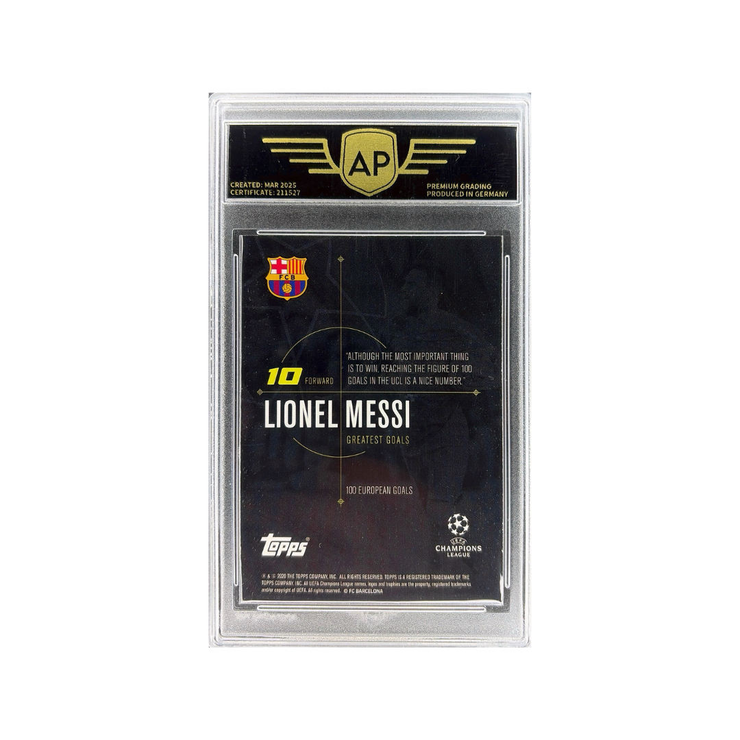 This card captures Messi in an iconic celebration pose following one of his historic Champions League moments. The sleek, dark design combined with bold yellow accents emphasizes the importance of this achievement, placing Messi among the greatest players in European football history. Professionally graded 9.0 MINT by AP Grading.