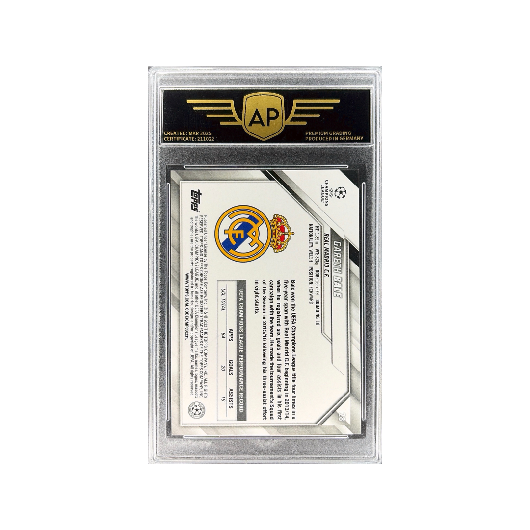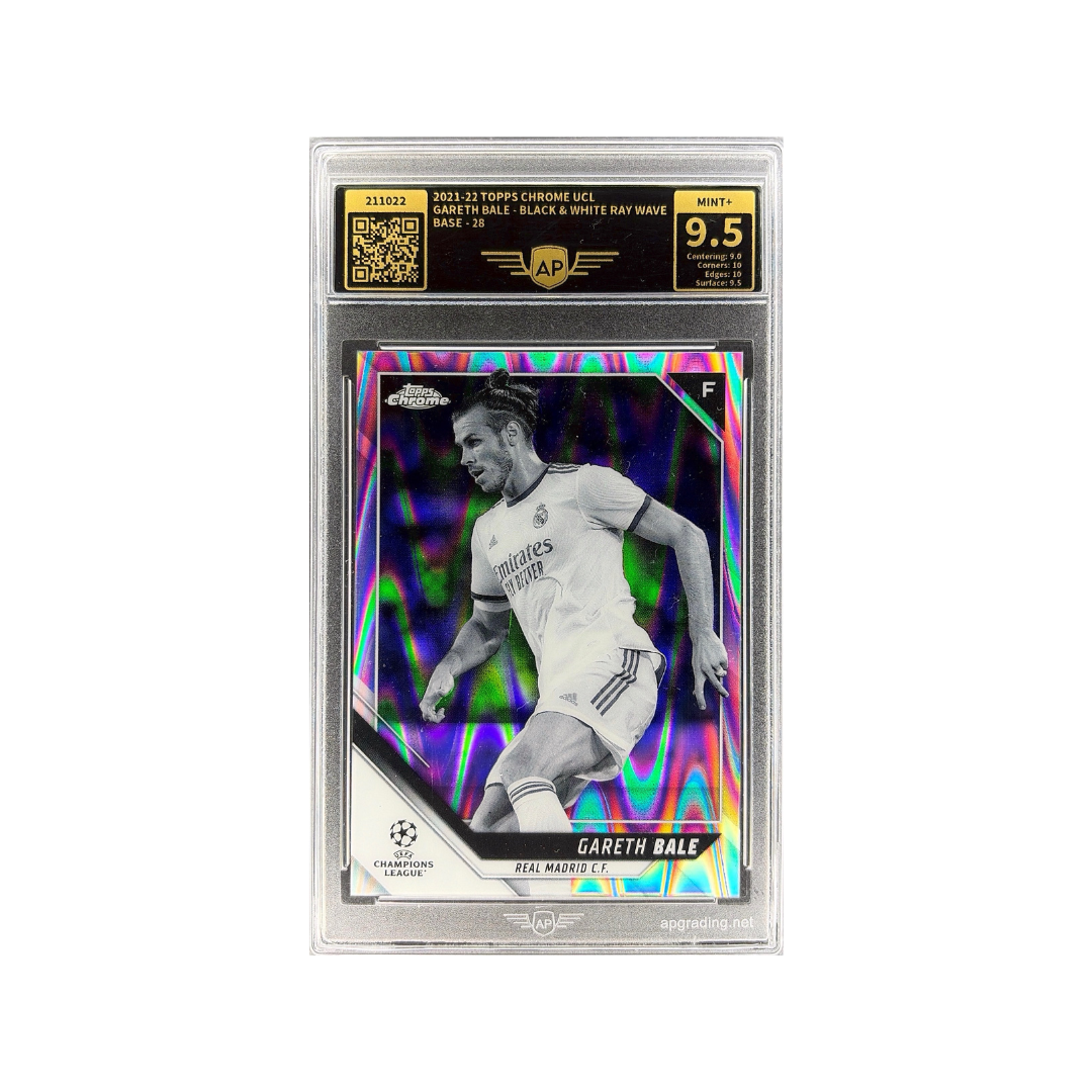 This card combines a sleek monochrome player image with a vibrant, wavy refractor background, creating a strong visual contrast typical of the popular RayWave parallels. A standout collectible highlighting Bale during his time at Real Madrid. Professionally graded 9.5 MINT+ by AP Grading.