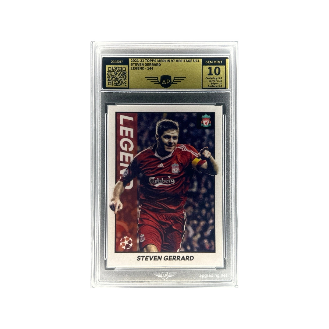 This card from the 2021–22 Topps Merlin UEFA Champions League – 97 Heritage set features Liverpool legend Steven Gerrard. The "Legends" subset celebrates iconic players who made a lasting impact on European football and the UEFA Champions League. Gerrard is widely regarded as one of Liverpool FC's greatest players and captains, remembered for his leadership, passion, and unforgettable performances, including the legendary 2005 UEFA Champions League final in Istanbul. The Merlin 97 Heritage design pays tribute to the classic 1997 Merlin sticker style, combining nostalgic design with modern Topps production. A graded 10 (GEM MINT) example represents a top-tier collectible for football and Liverpool fans.