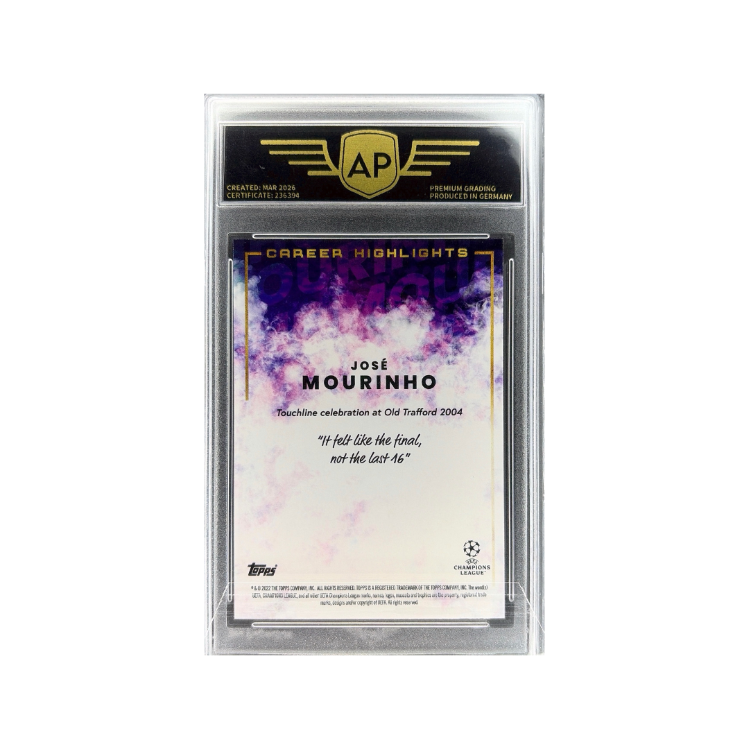 An iconic "Career Highlights" card capturing José Mourinho's legendary touchline celebration at Old Trafford. One of the most recognizable moments in modern football, showcasing the passion and charisma of "The Special One." A unique collectible that stands out among player-focused cards.