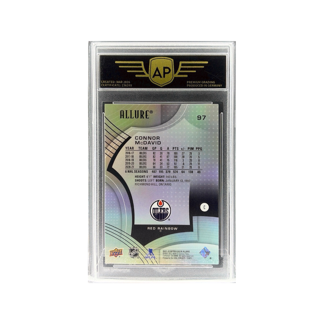 This vibrant parallel highlights one of the NHL's biggest superstars and captain of the Edmonton Oilers. The Allure Red Rainbow design stands out with bold colors and premium foil finish, making it highly attractive for collectors. Professionally graded by AP Grading with an excellent overall grade of 9.5 MINT+.