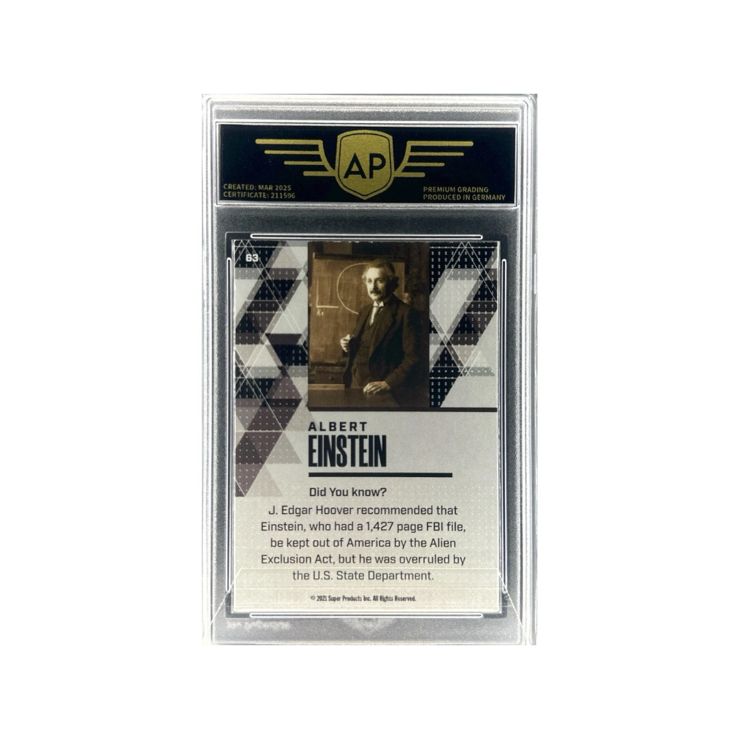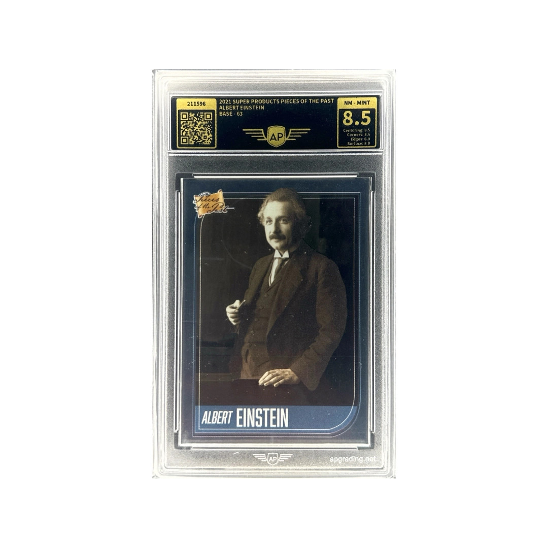 This card from the 2021 Super Products Pieces of the Past trading card set features Albert Einstein, one of the most influential scientists in history. Einstein is best known for developing the theory of relativity, including the famous equation E = mc², which revolutionized modern physics and our understanding of space, time, and energy. His work had a profound impact on theoretical physics and the development of modern science. The Pieces of the Past series highlights important historical figures who shaped science, politics, culture, and world history. This collectible card presents a classic portrait-style image of Einstein and has been professionally graded 8.5 (NM-MINT), indicating strong overall condition with only minor imperfections.