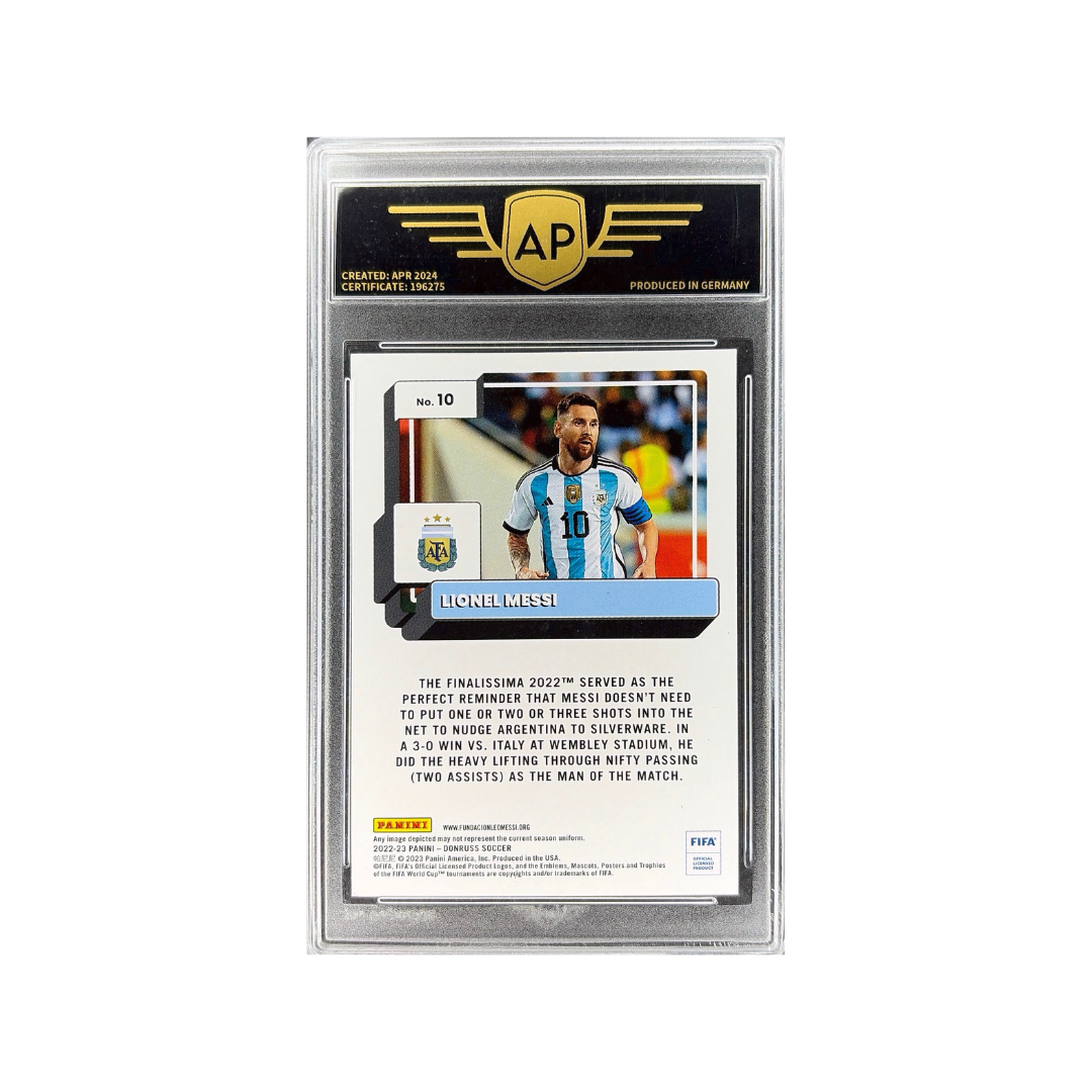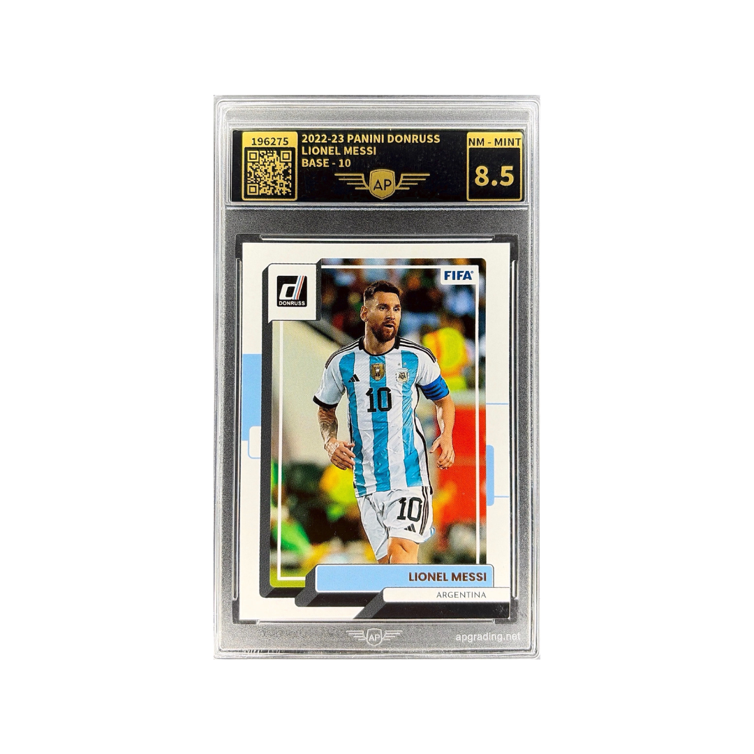 This release features a modern Donruss layout with a crisp frame and bright color accents, highlighting Messi in Argentina’s iconic national team kit. The design balances simplicity with strong visual clarity, making it a solid addition to any football card collection. Professionally graded 8.5 NM-MINT by AP Grading.
