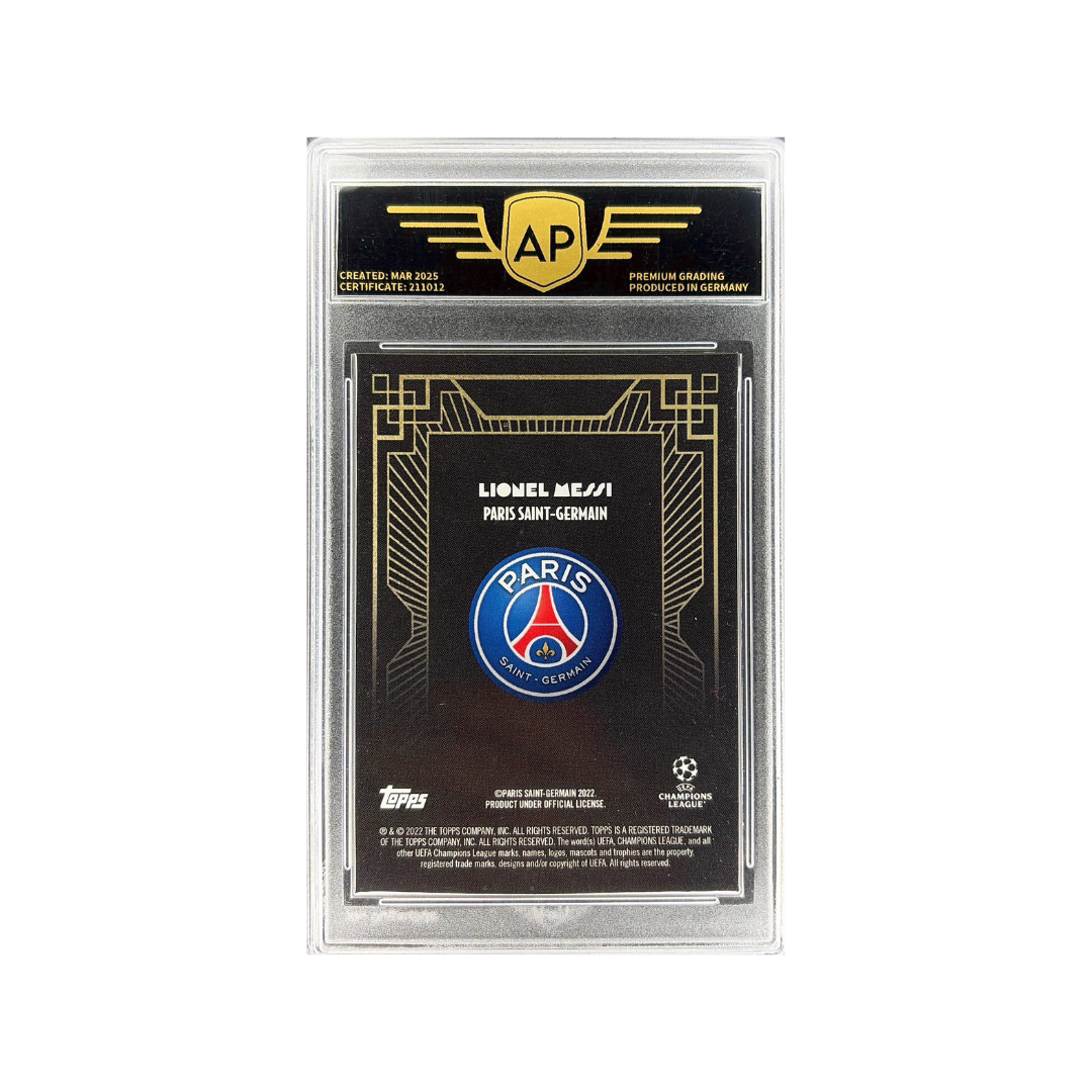 This Deco-style design stands out with its vintage-inspired geometric framing and gold-toned layout, giving the card a premium and timeless appearance. Featuring Messi in his Paris Saint-Germain kit, the card combines classic aesthetics with modern chrome quality. Professionally graded 9.0 MINT by AP Grading.