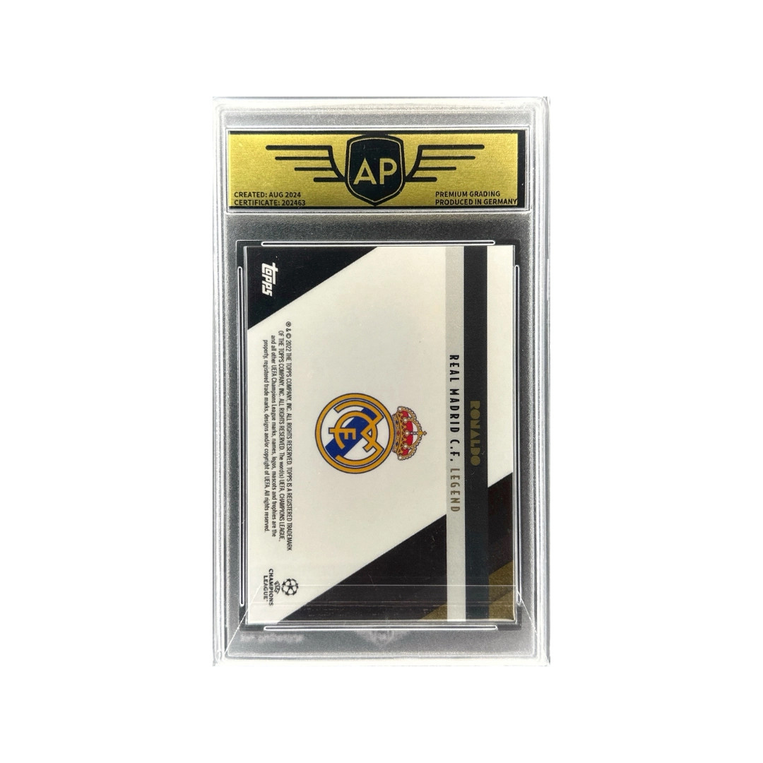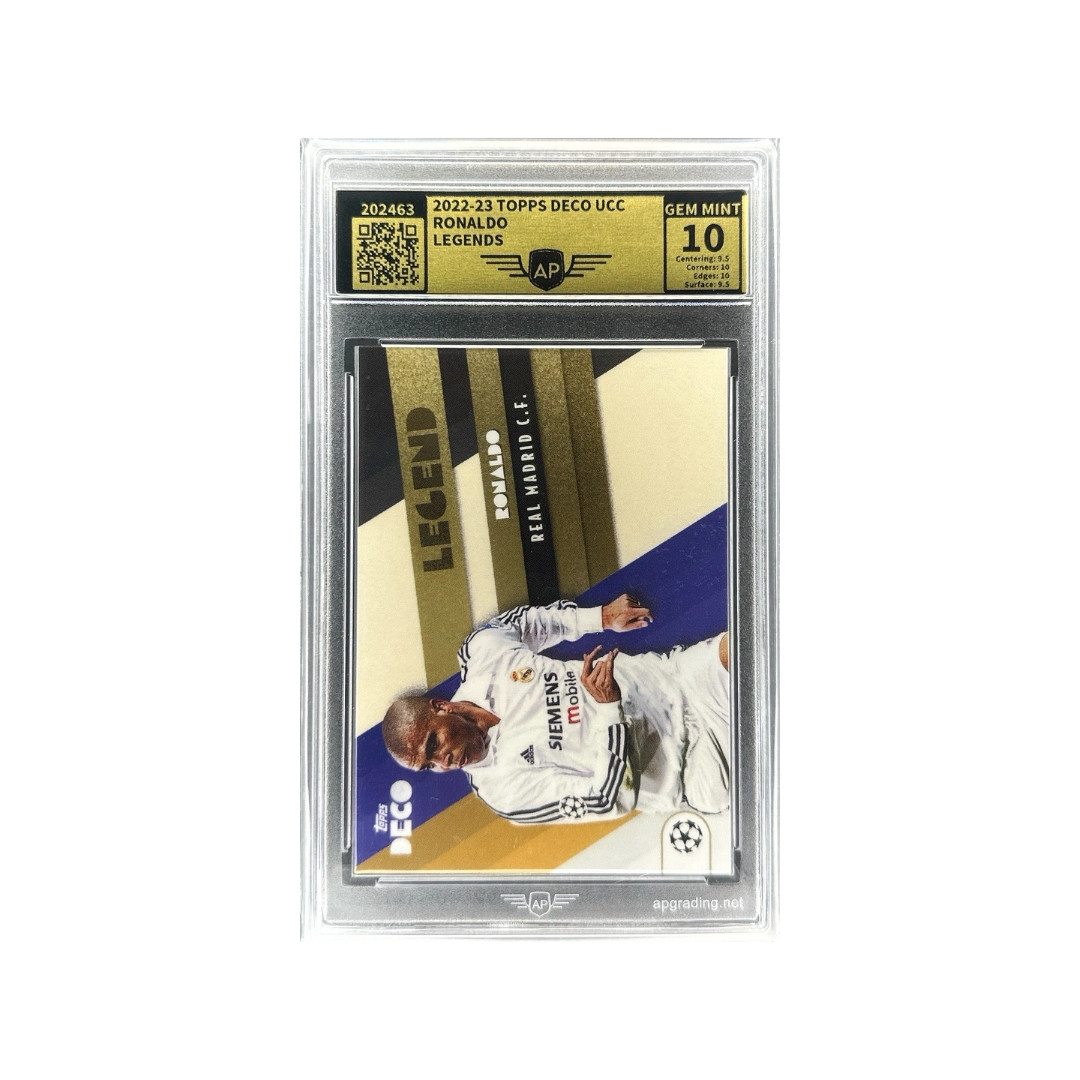 Prémium insert kártya a 2022–23 Topps Deco UEFA Club Competitions sorozatból, amely a brazil legendát, Ronaldót mutatja be a Real Madrid korszakából. A Deco sorozat elegáns art-deco stílusú dizájnjáról ismert.