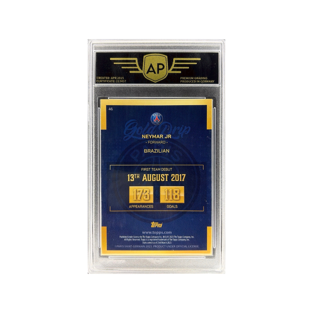 Táto karta 2022–23 Topps PSG Team Set Gold Drip (#46) zachytáva Neymara v drese Paris Saint-Germain, kde bol kľúčovou postavou útoku. Dizajn Gold Drip je vizuálne veľmi atraktívny a obľúbený medzi zberateľmi.