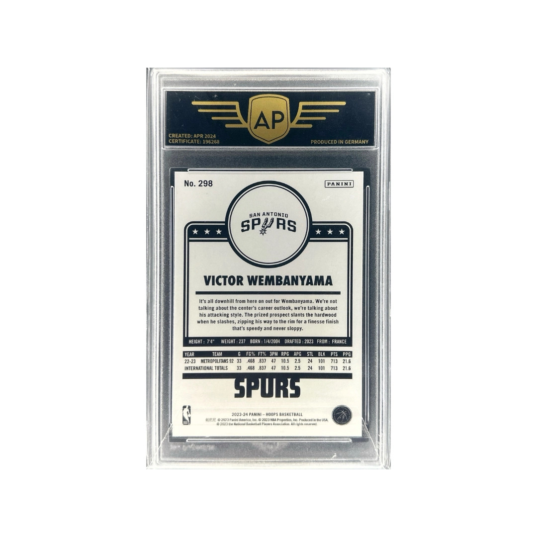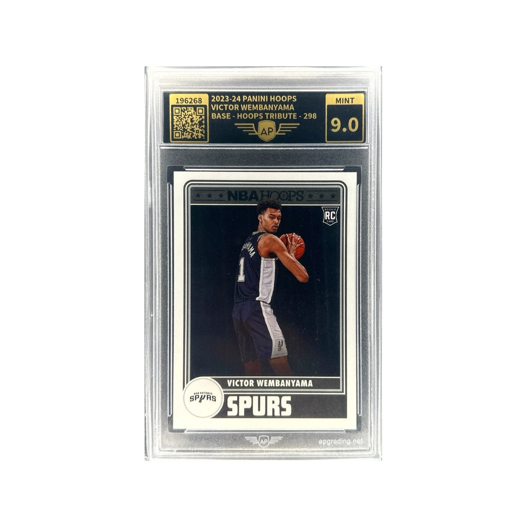 This card captures Victor Wembanyama during his anticipated debut season, showcasing the rising superstar in a tribute design inspired by classic Hoops layouts. Widely viewed as one of the most promising prospects of his generation, Wembanyama's unique skill set and size have already made his rookie appearances a major highlight for basketball fans worldwide.