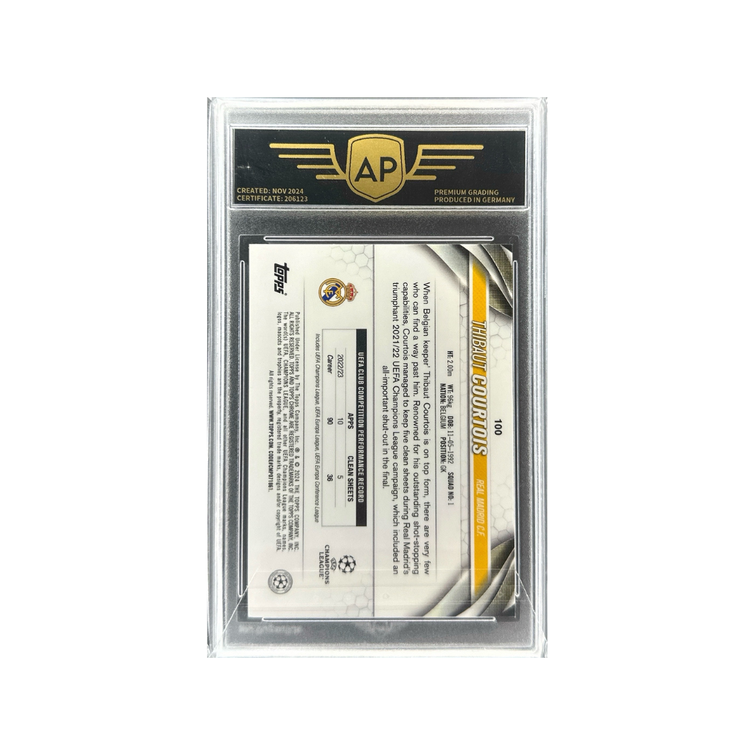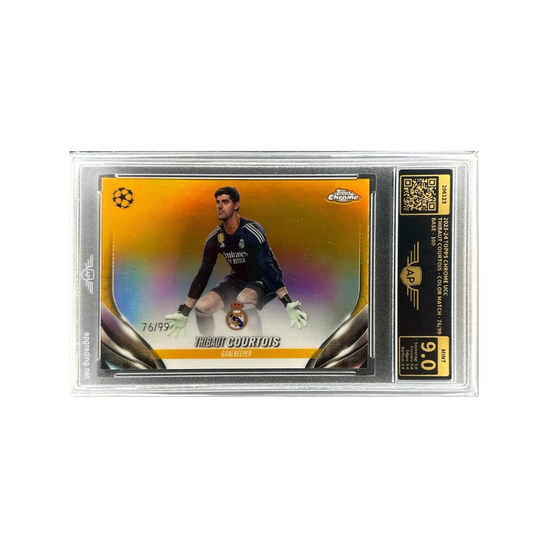 A striking limited collectible from the 2023–24 Topps Chrome UEFA Champions League series featuring Real Madrid star goalkeeper Thibaut Courtois. This Gold Match parallel is serial numbered to just 99 copies and showcases one of the most dominant goalkeepers of the modern era. With its bright gold finish and strong Mint 9 grade, this card stands out as a premium addition for Champions League and Real Madrid collectors.
