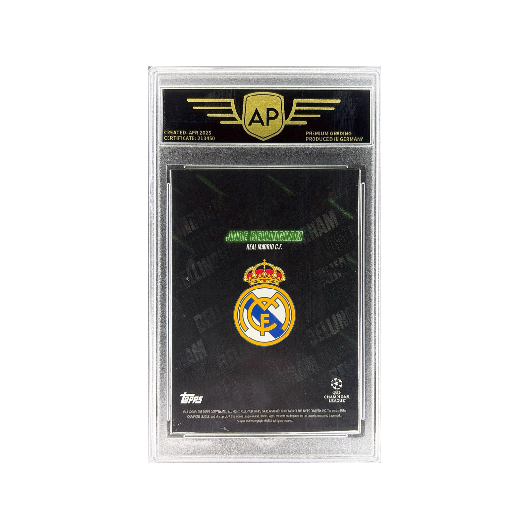 This card showcases a bold, modern design with a glowing halo effect and layered typography, emphasizing Bellingham’s rising superstar status at Real Madrid. The dramatic visual style perfectly matches his impact on the pitch and growing global popularity. Professionally graded 9.0 MINT by AP Grading.