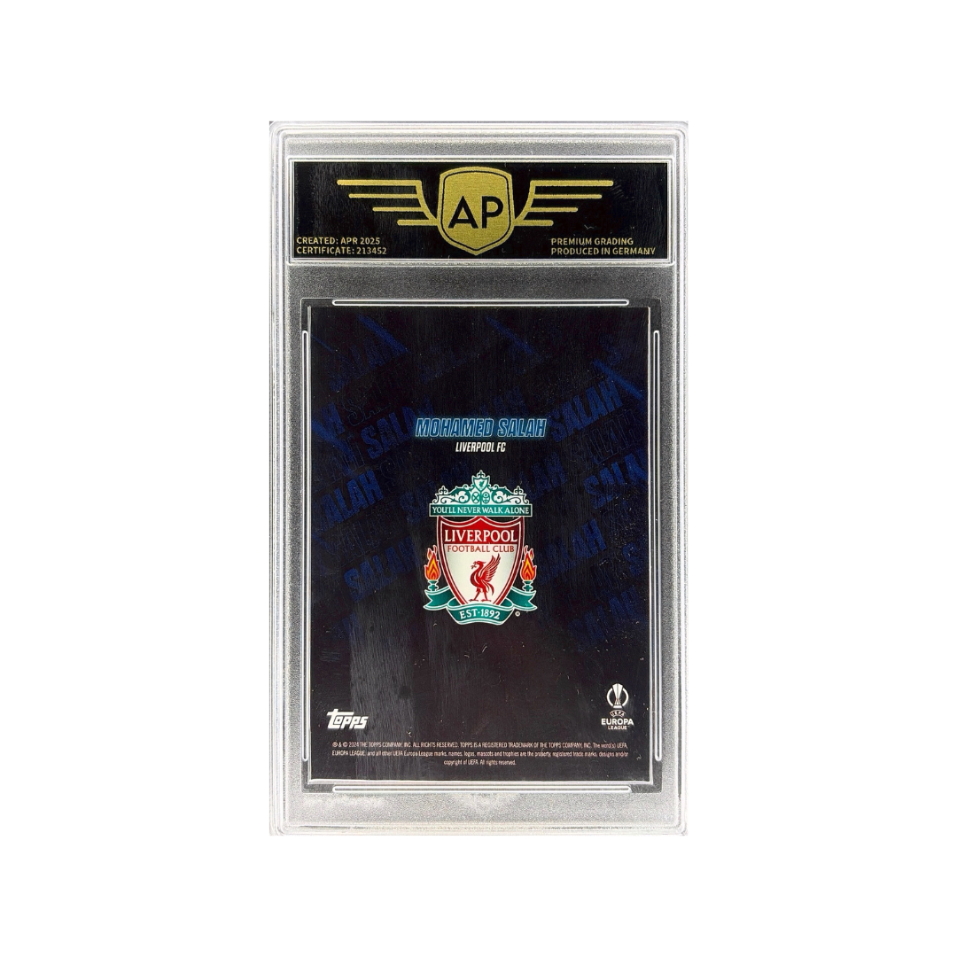 Limited “Blue” parallel from the 2023–24 Topps Showtime UEFA Club Competitions set featuring Mohamed Salah.