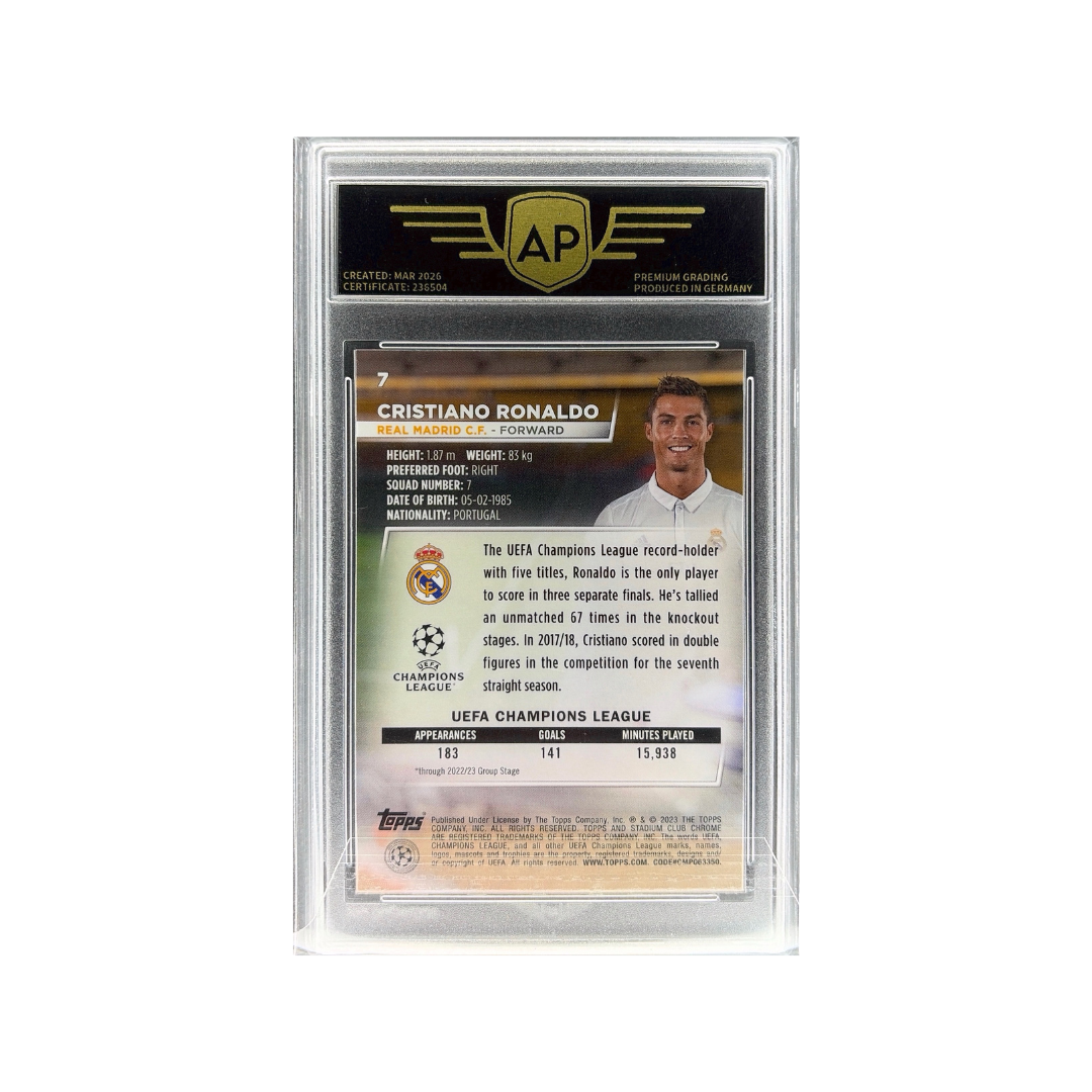 Eine ikonische Jubelszene von Cristiano Ronaldo aus seiner Real-Madrid-Glanzzeit. Die Stadium Club Chrome Serie ist bekannt für ihre hochwertigen Fotomotive – und dieses gehört zu den beliebtesten Ronaldo-Motiven.