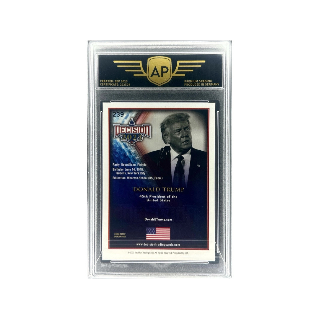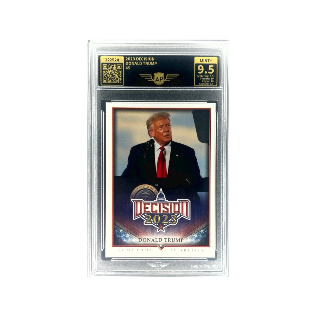 This trading card comes from the 2023 Decision Trading Cards series and features Donald J. Trump, the 45th President of the United States. The Decision 2023 set focuses on major figures and themes surrounding American presidential politics and elections.