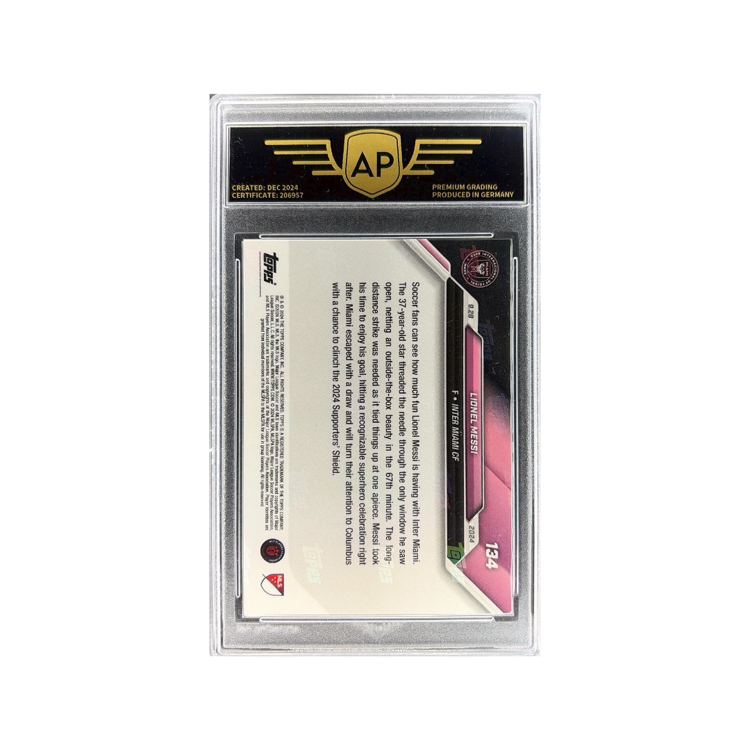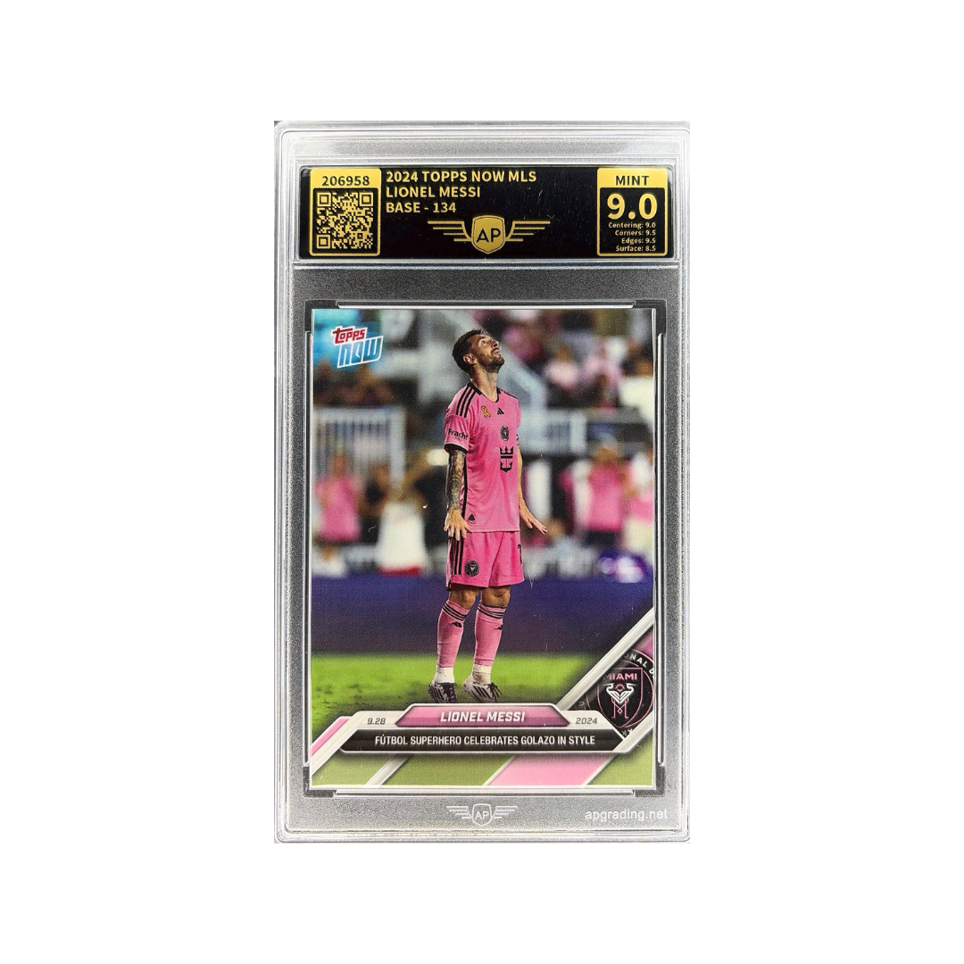 This base card captures a composed and reflective moment from Messi, highlighting his presence and influence in American soccer. The clean Topps Now design focuses on key moments from the season, making each release a snapshot of football history. Professionally graded 9.0 MINT by AP Grading.