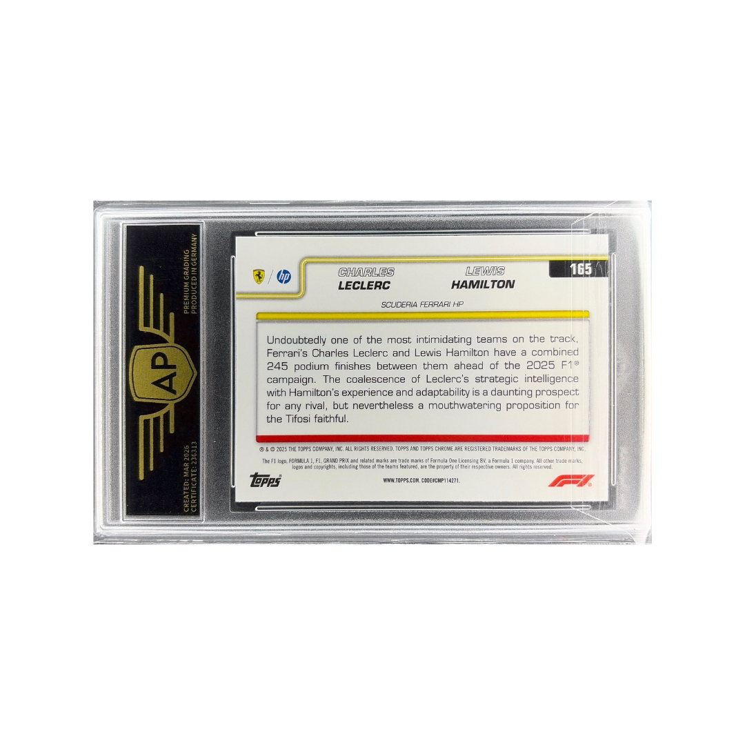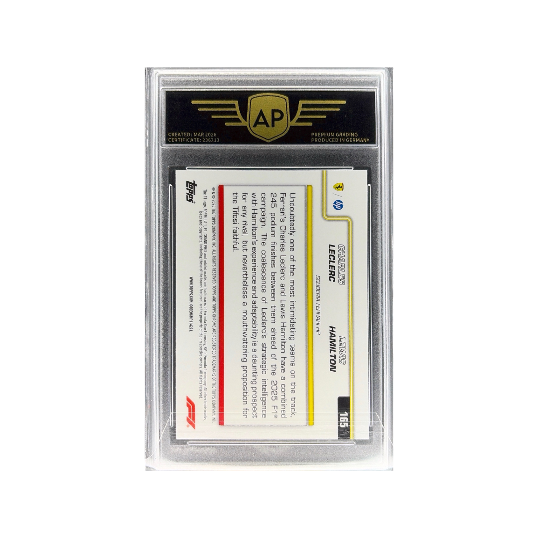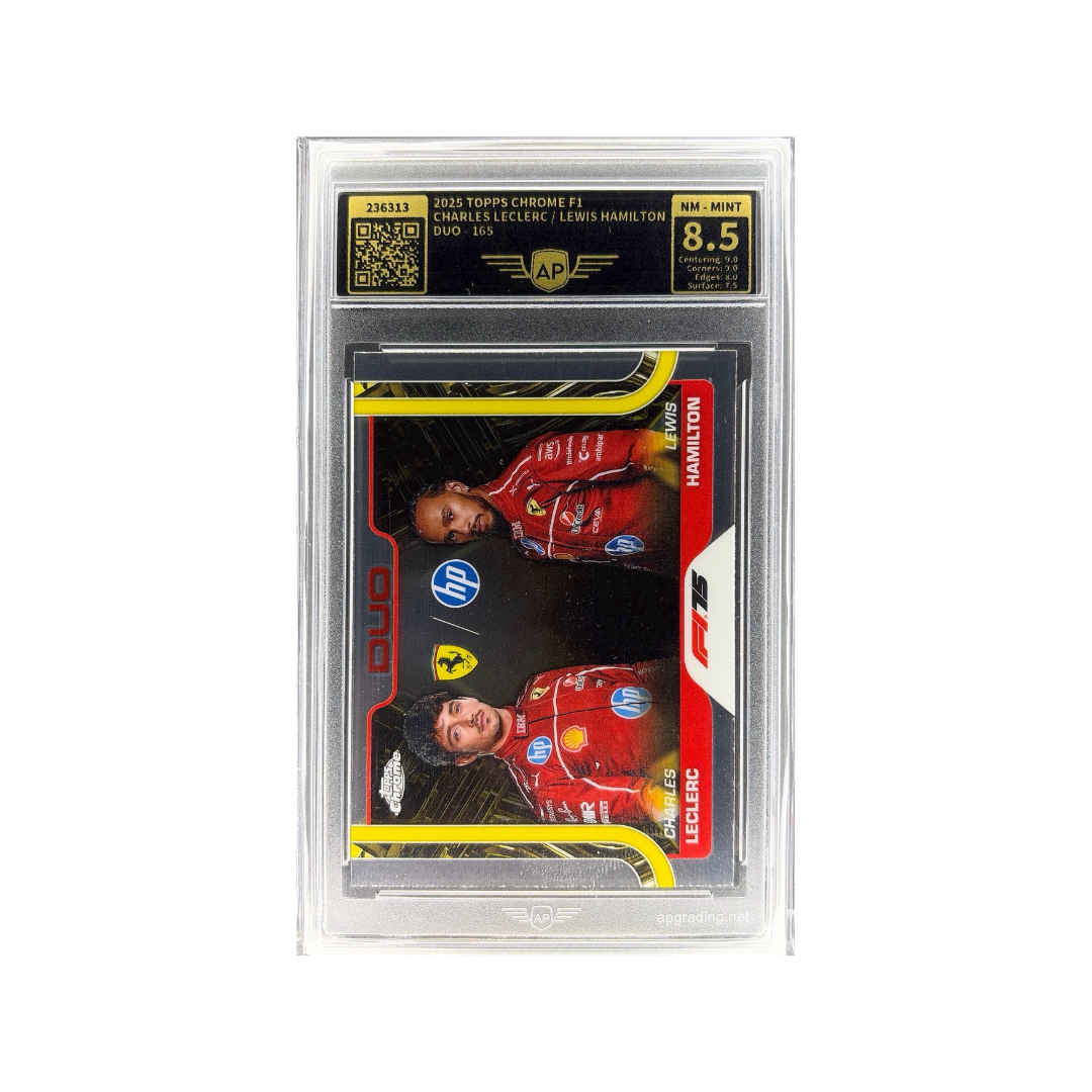 Dieses "Duo"-Insert vereint zwei der größten Namen der modernen Formel 1 — Leclerc als Hoffnungsträger von Ferrari und Hamilton als einer der erfolgreichsten Fahrer aller Zeiten. Das hochwertige Chrome-Design und die dynamische Gestaltung machen diese Karte besonders interessant für Sammler. Professionell bewertet von AP Grading mit der Note 8.5 NM-MINT.