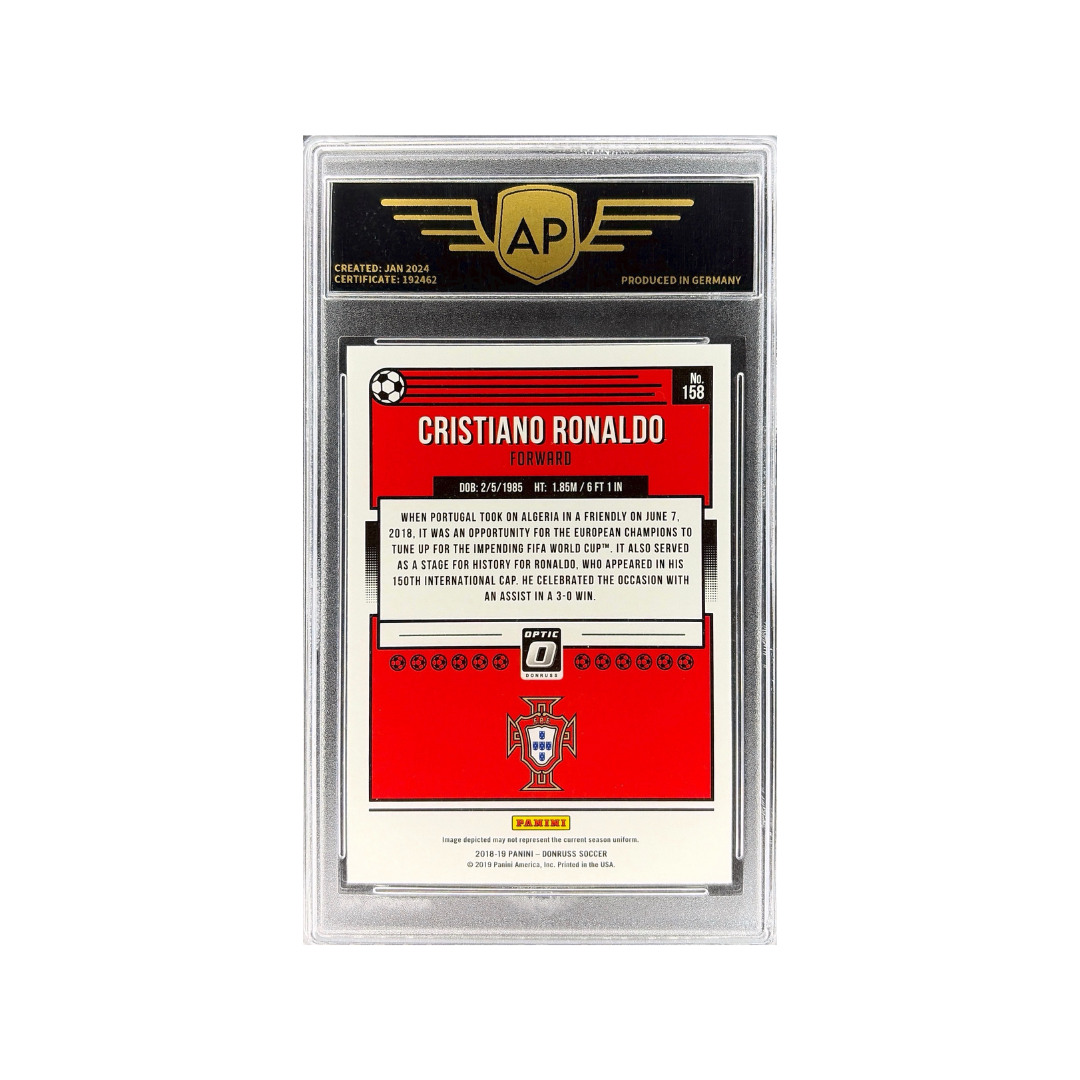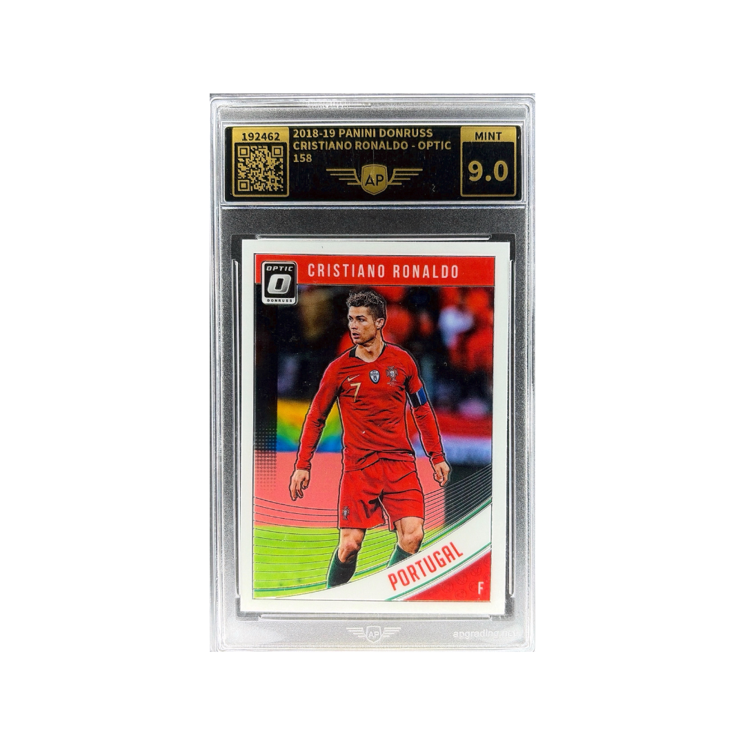 This chromium-style Optic card captures Ronaldo representing Portugal, showcasing his legendary presence on the international stage. Known for its glossy finish and modern design, Donruss Optic brings a premium feel to classic Donruss aesthetics. A must-have for collectors of Ronaldo and international football icons. Professionally graded 9.0 MINT by AP Grading.