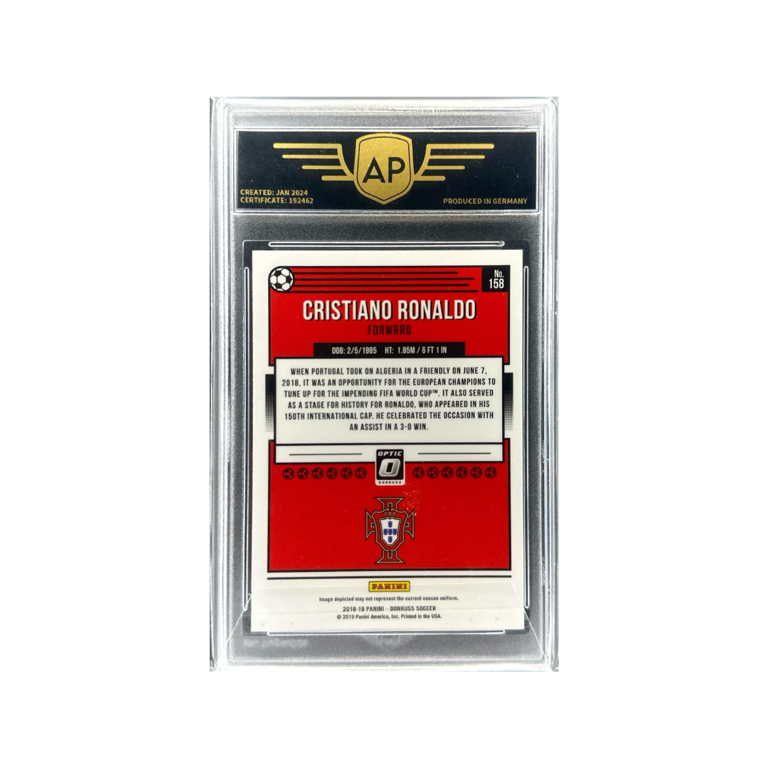 Ez a 2018–19 Panini Donruss Optic kártya Ronaldót Portugália színeiben mutatja be, és pályafutásának egy olyan időszakát idézi meg, amelyet történelmi jelentőségű nemzetközi sikerek jellemeztek. Az Optic krómozott felület éles részleteket, élénk színeket és modern megjelenést biztosít, így ez a kiadás Cristiano Ronaldo egyik leggyakrabban gyűjtött kortárs alaplapja.
