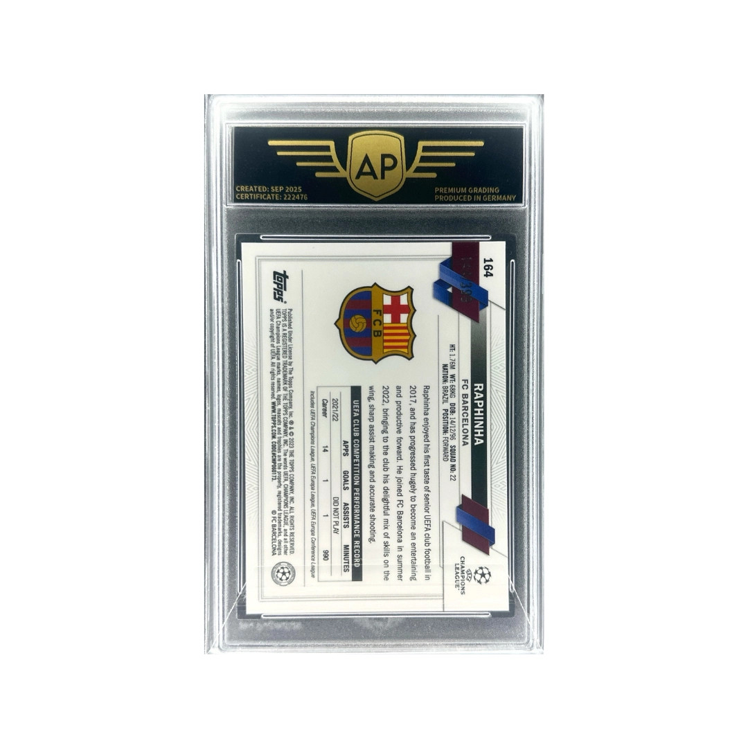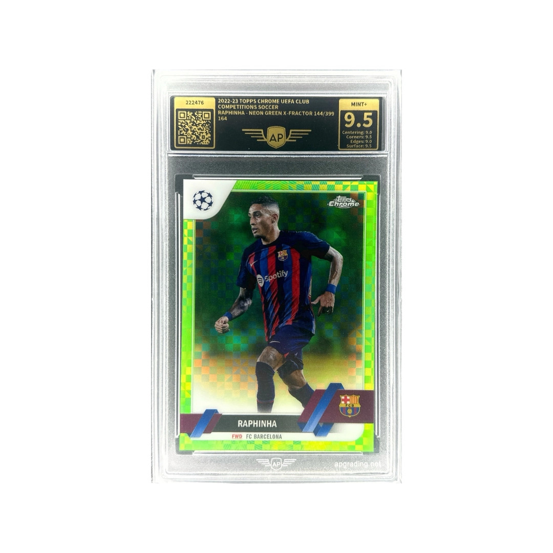 This card comes from the 2022–23 Topps Chrome UEFA Club Competitions set and features Raphinha, winger for FC Barcelona and the Brazilian national team.