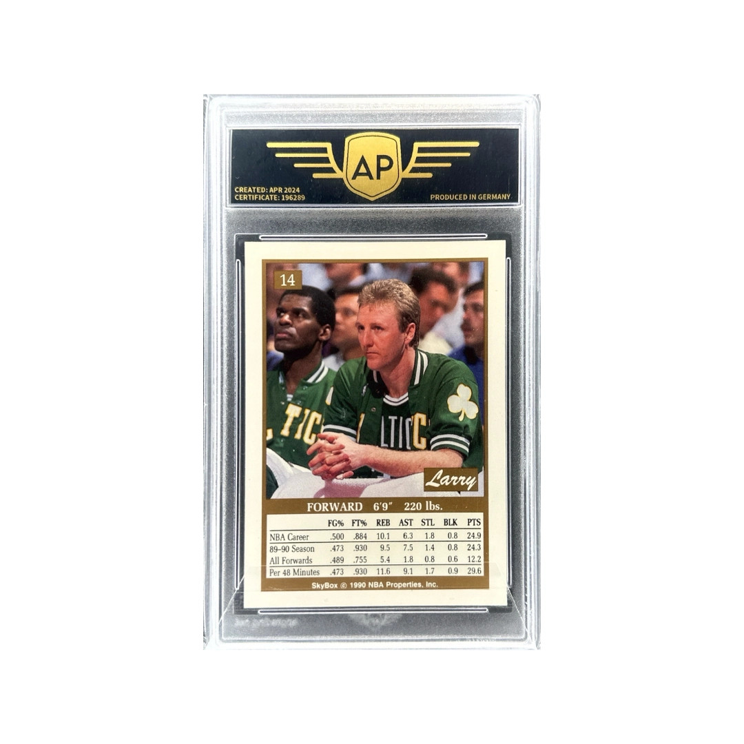 Ez a SkyBox kártya Larry Birdet ábrázolja az 1990-es szezonból, amikor továbbra is kiemelkedő vezetői képességeit és játékolvasását bizonyította. A 90-es évek elejére jellemző élénk dizájn hangsúlyozza dominanciáját és következetességét. Igazi klasszikus egy legendás játékostól.