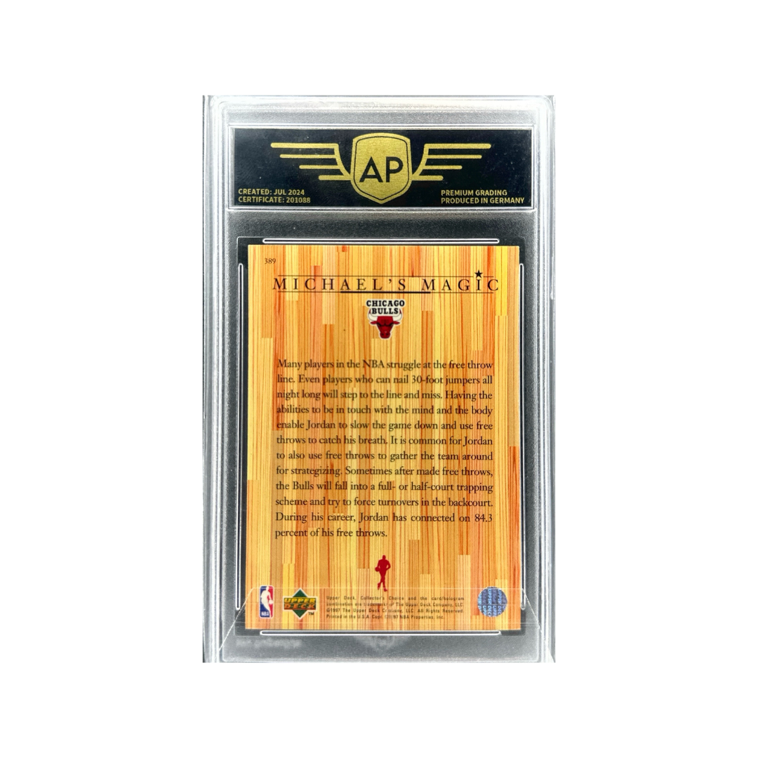 Tato karta oslavuje Michaela Jordana v jeho vrcholné formě a zachycuje jeho ikonické momenty s Chicago Bulls během sezóny 1997–98. Zvýrazňuje jeho legendární skórování a vedení týmu a uchovává jeho dopad na hřišti, který upevnil jeho odkaz jako jednoho z největších hráčů historie NBA. Každý detail této nezapomenutelné sezóny je zachován, což z této karty činí ceněný kousek pro sběratele a fanoušky, kteří oceňují vrcholné období basketbalu Bulls.