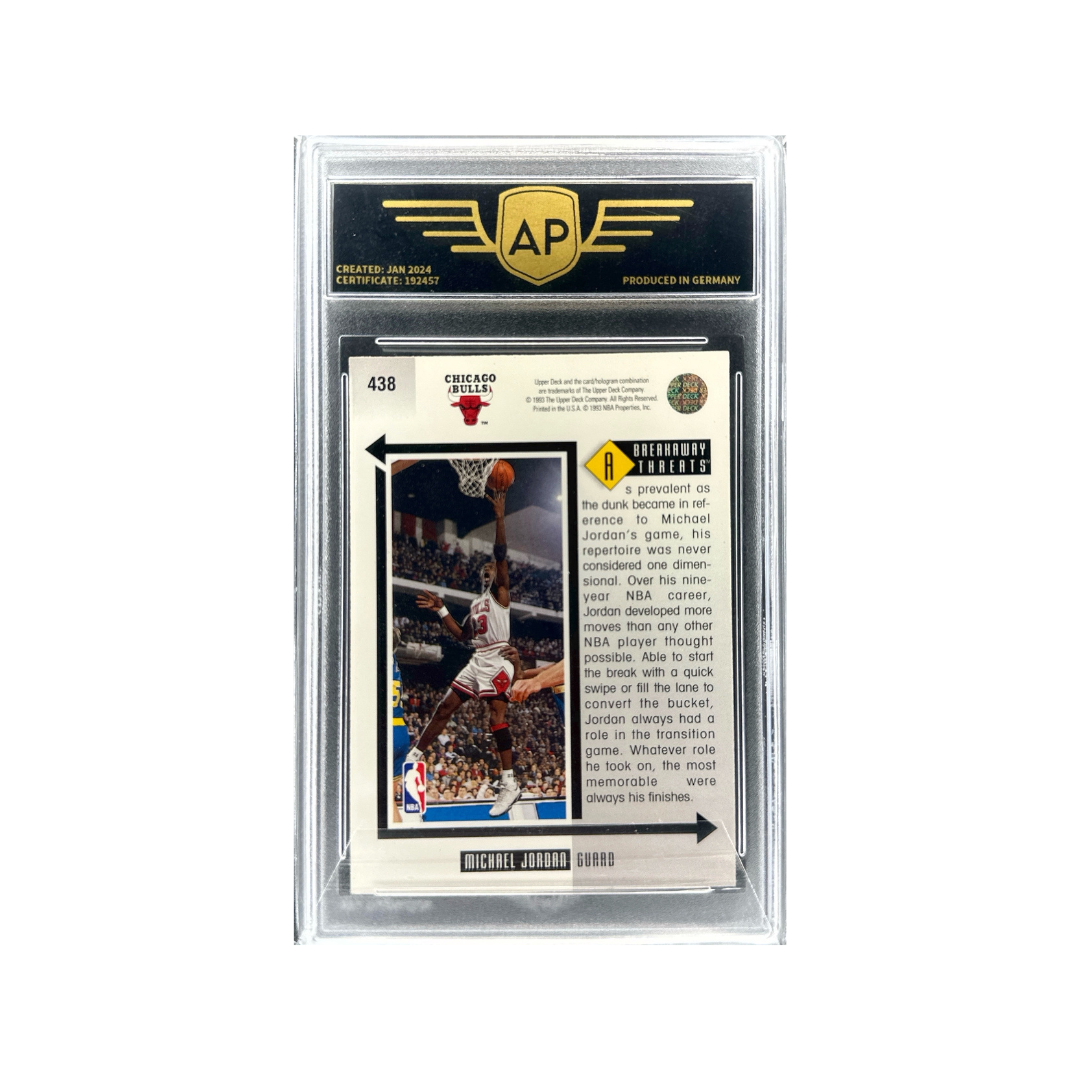 Ten insert Breakaway Threats z serii 1993–94 Upper Deck NBA doskonale oddaje tę dynamikę. Koncepcja została stworzona z myślą o graczach stanowiących największe zagrożenie w kontrze, a Jordan w czasach dynastii Chicago Bulls był jej absolutnym ucieleśnieniem. Jeden eksplozujący krok, otwarta przestrzeń — i pełna kontrola nad momentem.
