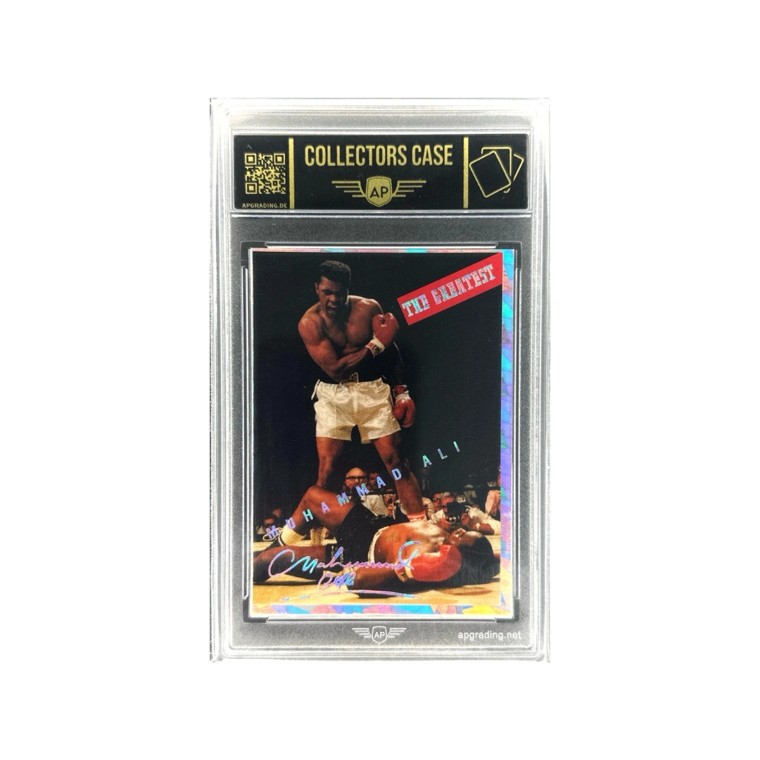 This collectible promo card features Muhammad Ali, widely regarded as one of the greatest boxers and most influential athletes in sports history. Known as "The Greatest," Ali became a global icon through his extraordinary boxing career, charismatic personality, and cultural impact far beyond the sport. The card showcases the legendary moment of Ali standing over a fallen opponent — one of the most iconic images associated with his dominance in the heavyweight division. This example is presented in an AP Collectors Case, offering protection and display quality for collectors of historic sports memorabilia.