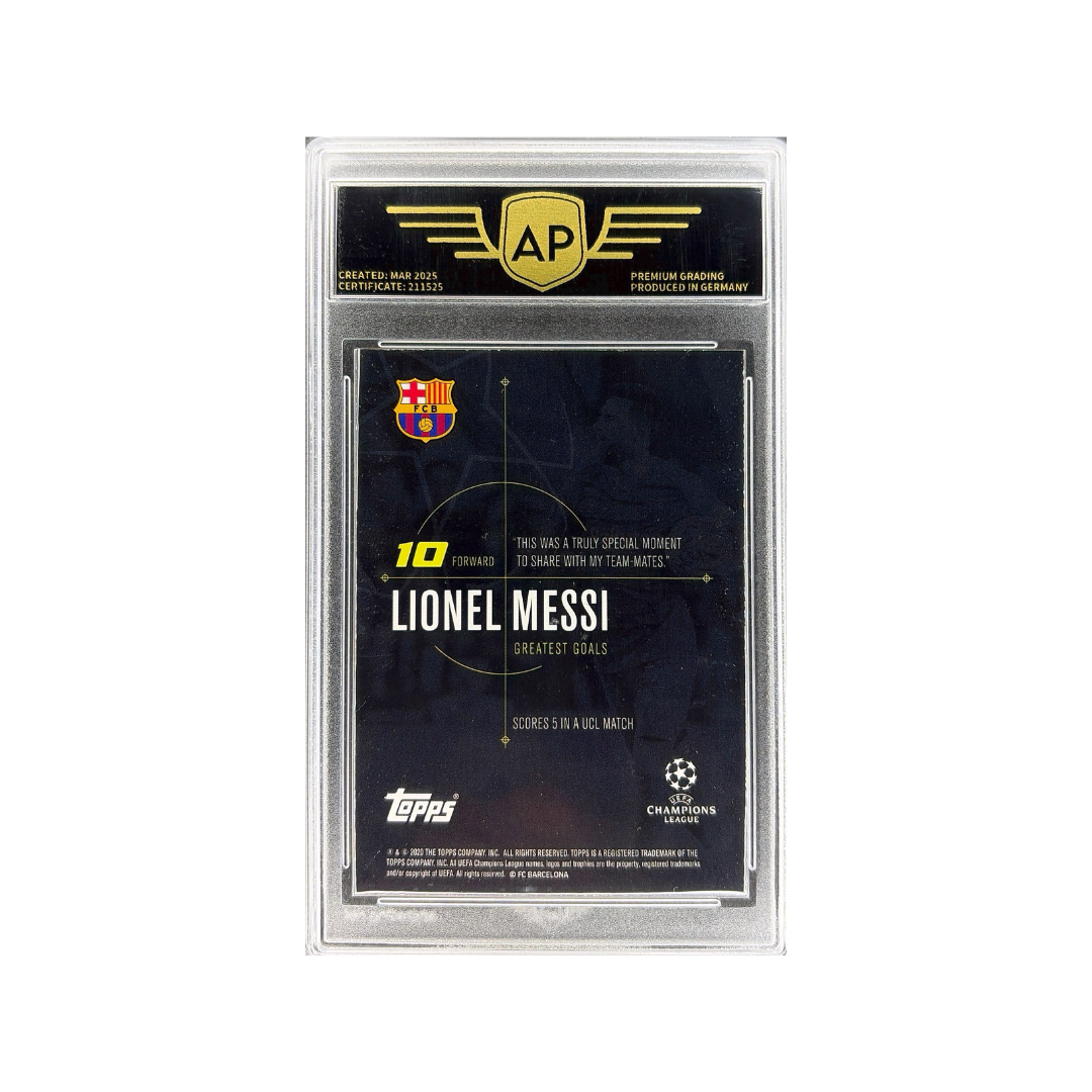 The card presents Messi during a confident in-game moment, reflecting his dominance and clinical finishing on the biggest stage. The clean layout and milestone-driven theme emphasize one of the most remarkable individual performances in UCL history. Professionally graded 8.5 NM-MINT by AP Grading.