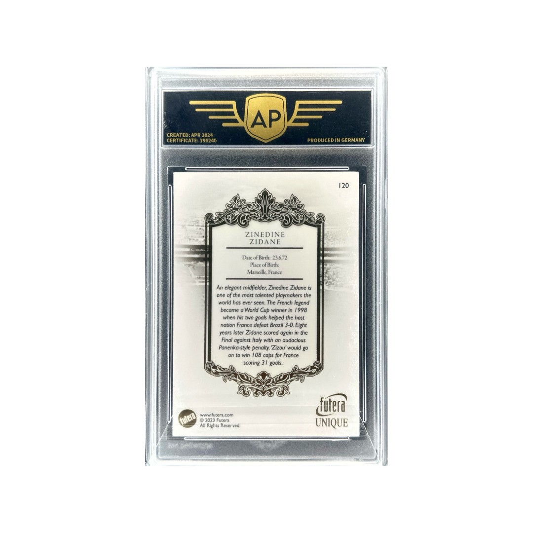 La carte rend hommage à la carrière exceptionnelle de Zidane, notamment à ses performances mythiques avec l'équipe de France et à son rôle décisif lors de la Coupe du Monde 1998, où il inscrivit deux buts en finale. L'esthétique raffinée de Futera Unique associée au concept The Greats transforme cette carte en une véritable pièce commémorative, bien au-delà d'une simple carte moderne.
